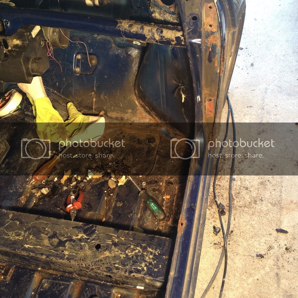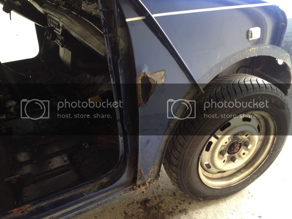 Auf beiden Seiten kleine Löcher in den Einstiegsleisten und Große im Fußraum. Das Problem des falschen Aufbockens ist bekannt und hier sieht man die Spätfolgen. Auch das Scharnierblech sieht von dieser Seite schon nicht gut aus.