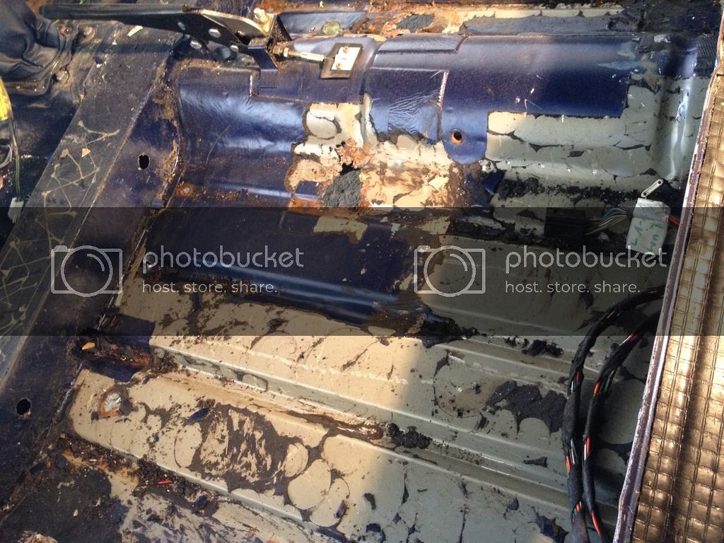Der Fahrzeugboden hat diverse Flickstellen an den Seiten, die allesamt wieder neuen Rost angesetzt haben. An den Stellen wo die Sitze aufliegen sah der Boden merkwürdig eingedrückt und braun aus. Unterm Bitumen war der Grund schnell gefunden. An einigen Stellen stand in den Sicken unterm Bitumen sogar noch Wasser. Da wundert einen gar nix mehr.