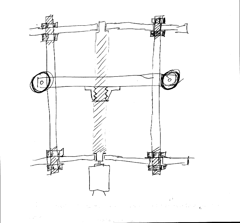Diese drei Stäbe (Gewinde + 2x rund) gehen durch einen Stück gewinkeltes Blech, wobei die beiden Seiten ganz normal gelagert sind, während in der Mitte eine Mutter angeschweißt wird. (Noch besser is so ein komischer Gewindeflansch, wie ich ihn in der Bastelkiste gefunden hab. Weiß aber nich wie das genau heißt)