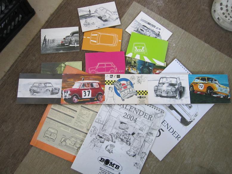 - 1 Set Bilder und Kalender vom Mini. Zeichnungen von BOMB, aufgeklebt auf dünnem Holz, die ich dann mit Silikon auf einer Wand befestigt habe. Interessante Motive!! 8x 10x14cm, 1x 10x74cm, 2x Kalender, 1x DIN A4 Bilderrahmen. 12 Euro zzgl 6,50 Versand (weil das eine Bild sehr lang ist).