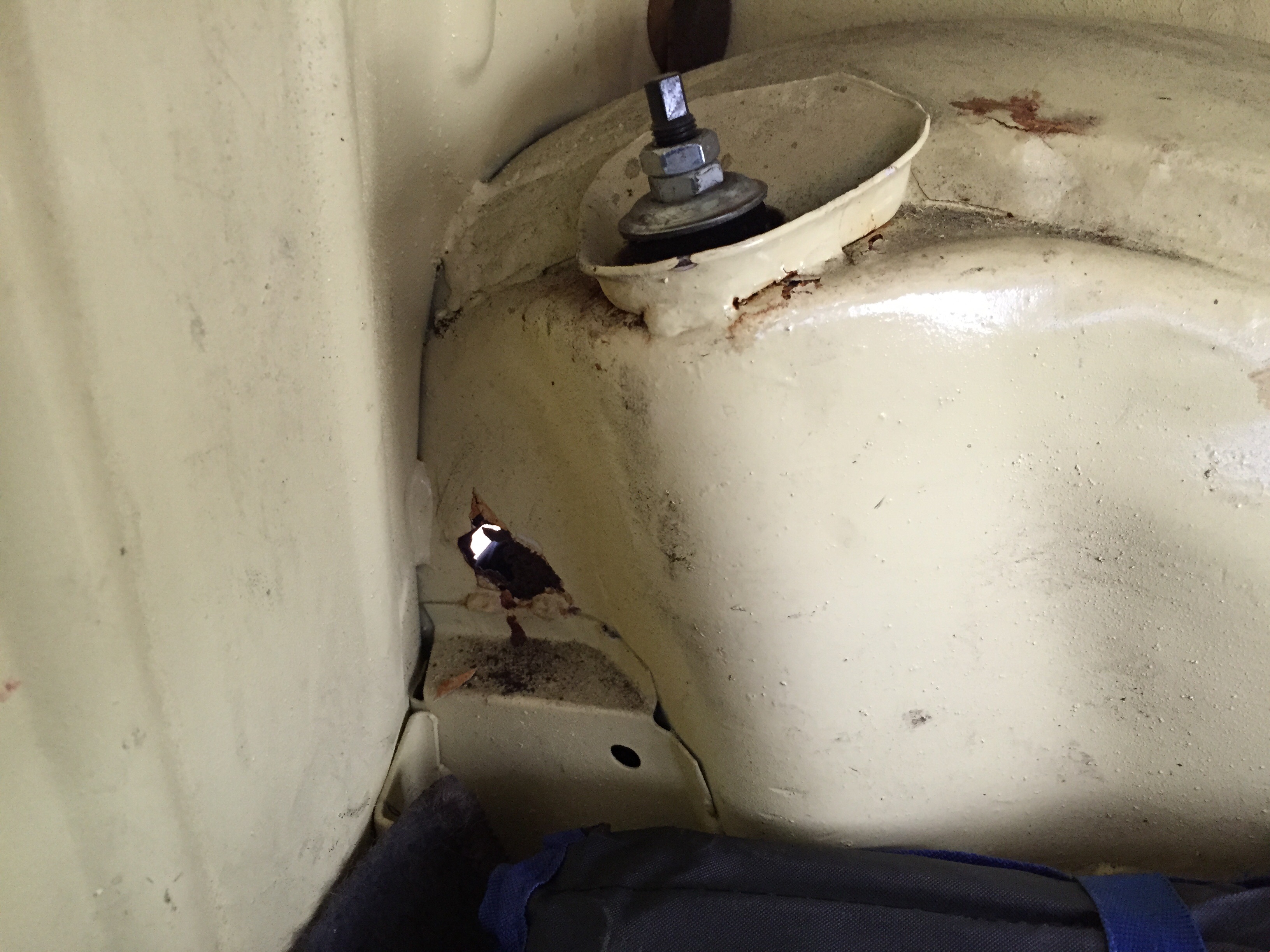 Ein Loch unter der Rücksitzbank in der Ecke bei der Hilfsrahmenaufnahme