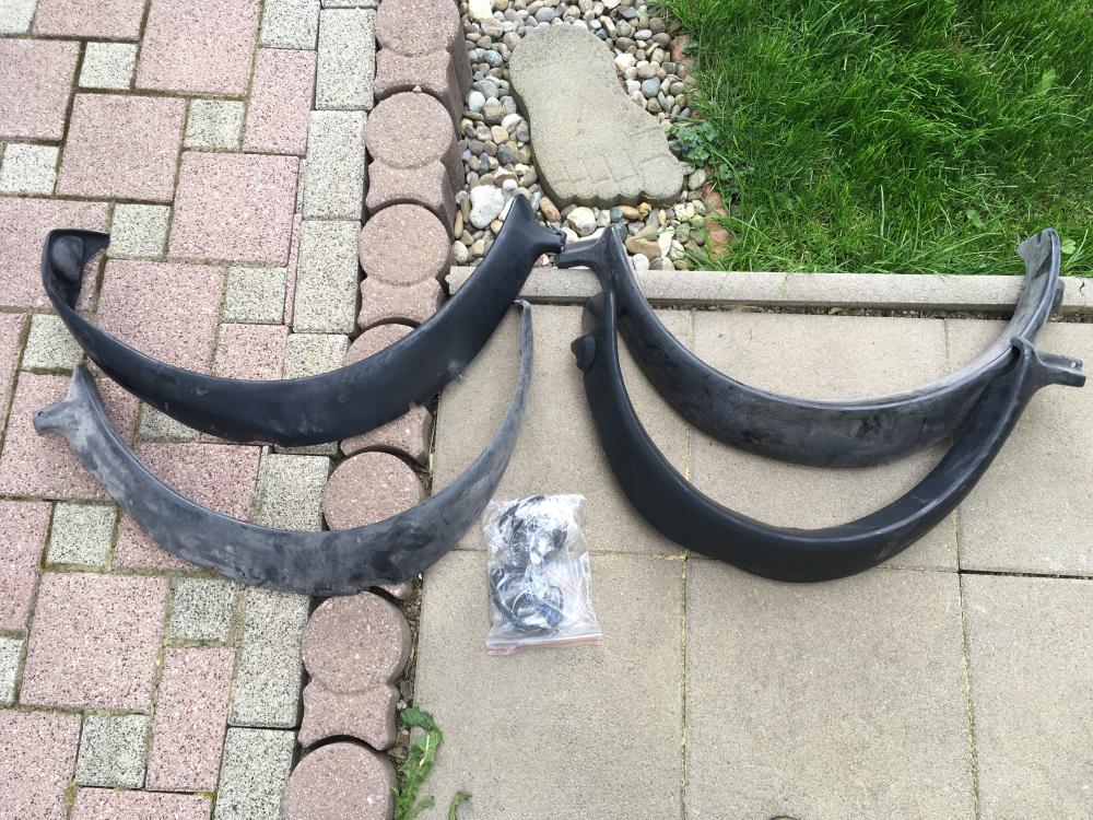 Habe hier zwei Sätze von den Verbreiterungen liegen. Befestigung von außen nicht sichtbar, also eingegossenen Gewindestangen. Die Verbreiterungen sind recht weich, also einer Mischung aus Kunststoff und Gummi. Farbe ist schwarz, das gräuliche ist einfach schmutz, der sich aber recht einfach abreiben lässt. Ob die Verbreiterungen lackiert werden können, weiß ich nicht. Wie gesagt sie erinnern an Gummi. Mit dabei sind Keder zwischen der Karosserie und der Verbreiterung.