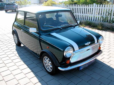 Natürlich wie sich das gehört in British-Racing-Green mit weissem Dach und streifen auf der Motorhaube, John Cooper Schriftzug, und so Gimmicks wie glänzende Edelstahlscheibenwischer, Aston-Tankdeckel usw...