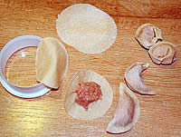 In die Mitte kommt ein Espressolöffel von der Füllung, dann wird der halbe Rand mit etwas Wasser benetzt und der Teigling halbiert, so dass ein geschlossener Halbkreis entsteht. Die Enden zieht man dann vorsichtig in die Länge und wickelt sie um einen Finger - so dass die typische Tortelliniform entsteht. Mit einem Tropfen Wasser auf einem der Zipfel hält man das ganze zusammen.