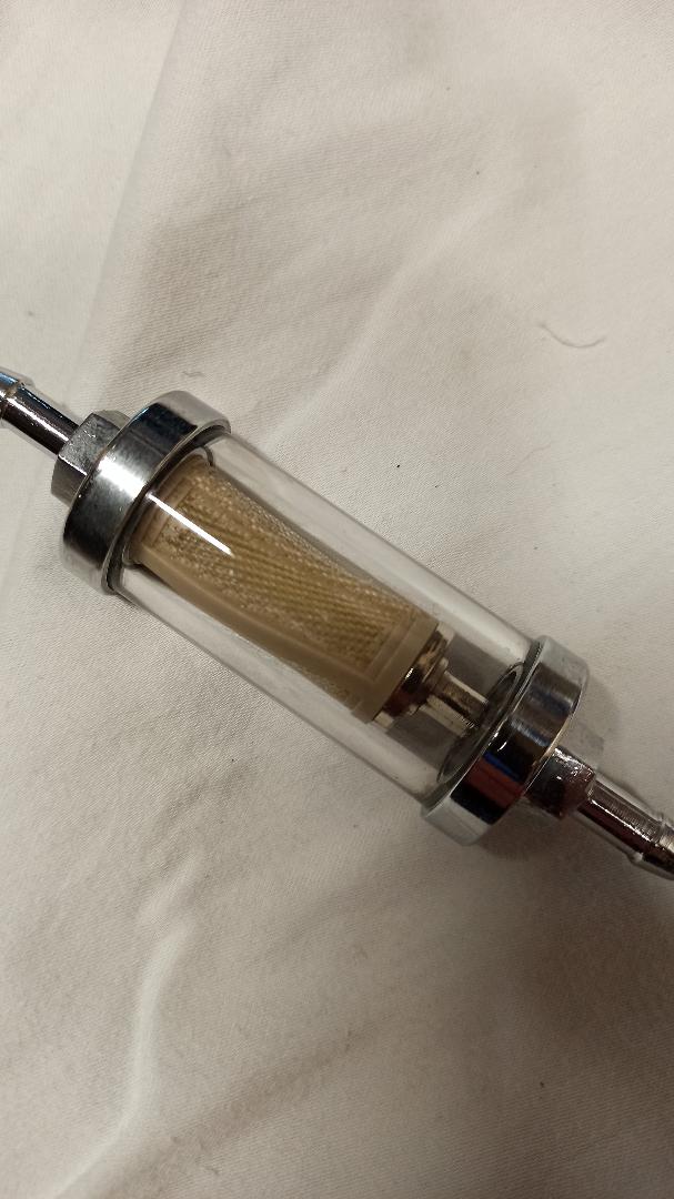 Sieht aus wie kleine weisse Kristalle ,der Benzinfilter ist aber sauber , kaum ein Krümel drin .
