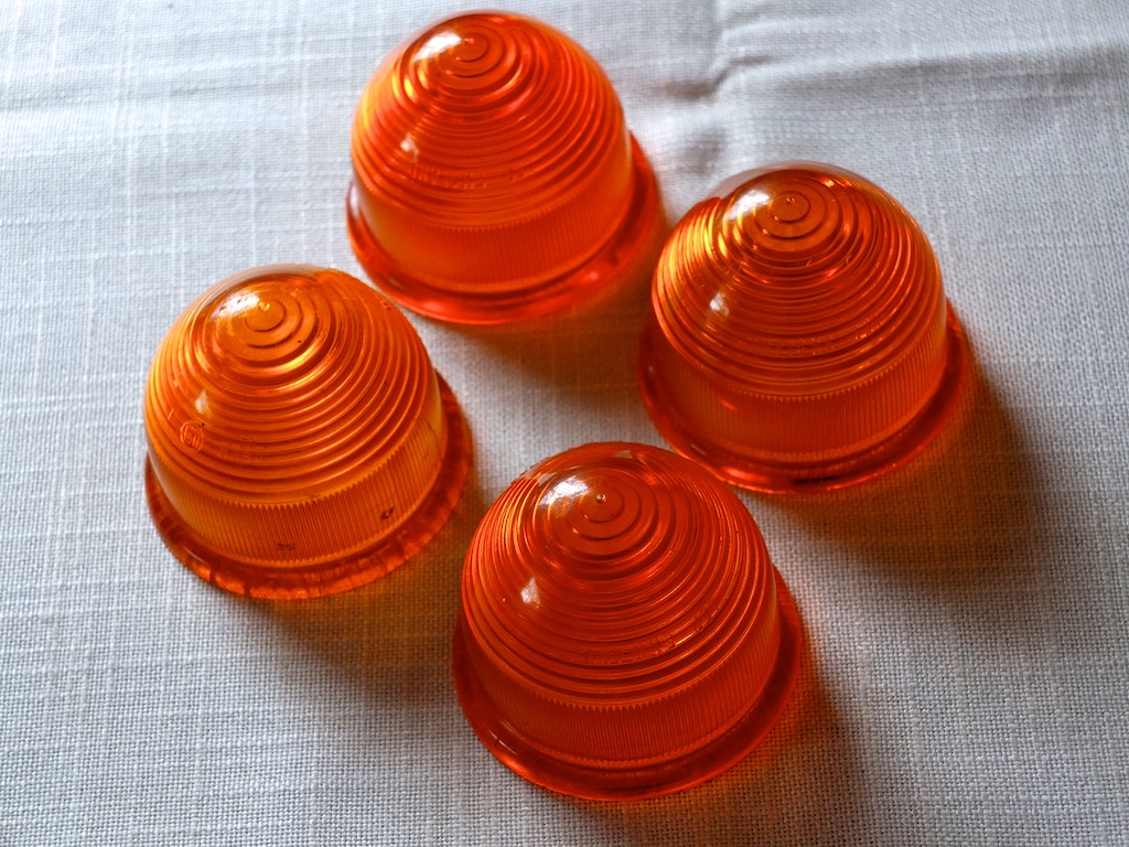 Die Gläser sind gebraucht aber gut und nicht ausgeblichen. Eines hat Risse am Fuß, kann aber getrost montiert werden, da die Risse in der Dichtung verschwinden. Es sind die Blinkergläser, die mit dem Chromring in die Gummifassung geklemmt werden.