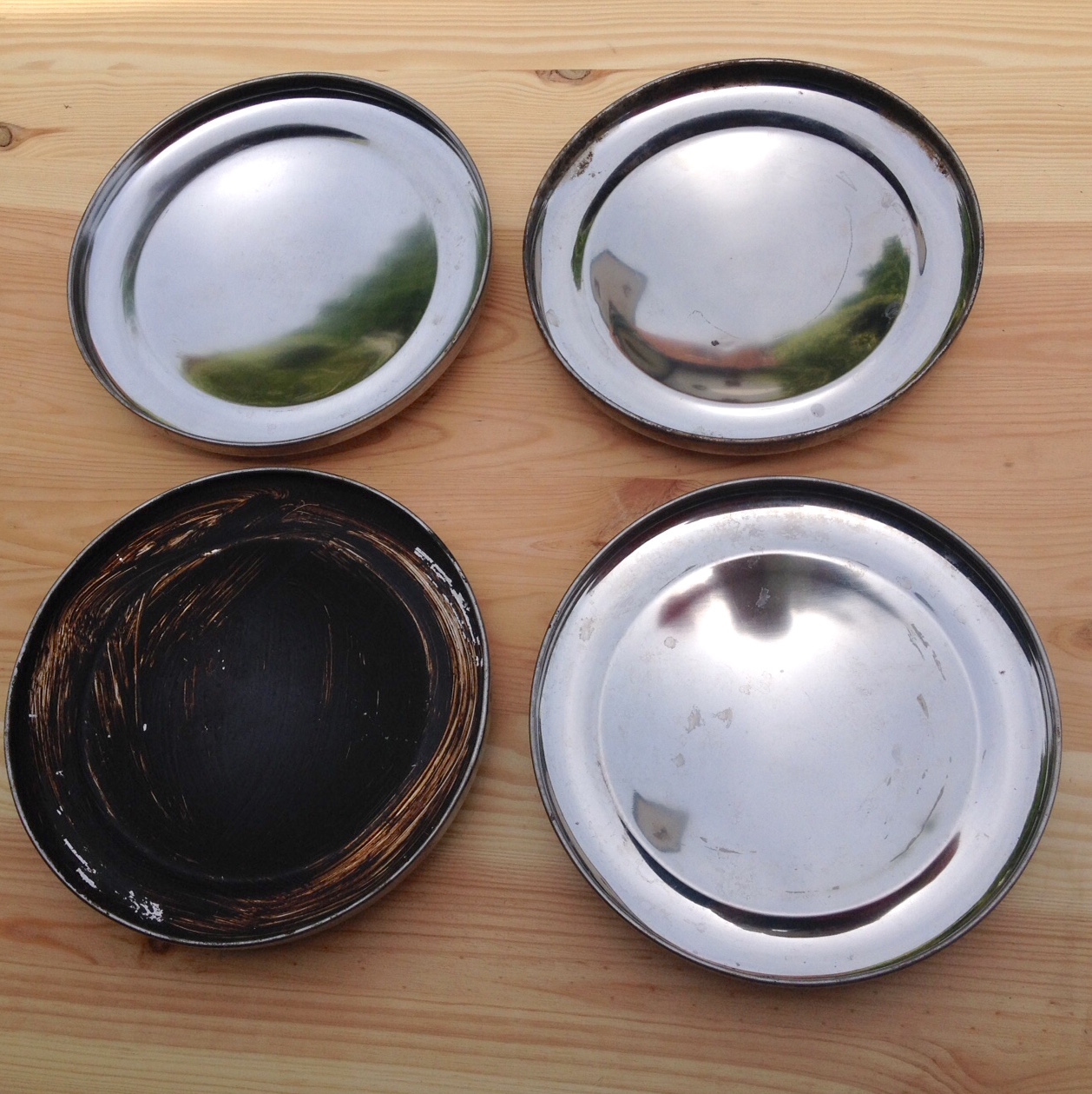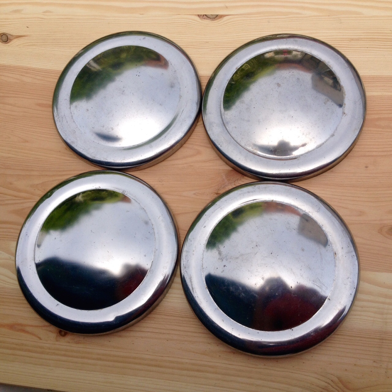 Vier Radkappen für den 10" MINI aus den 60er oder 70er Jahren. Es handelt sich um die kleinen Radkappen, die nur den Lochkreis abdecken. Die Kappen haben Gebrauchsspuren wie Kratzer und kleine Dellen, sind aber rostfrei! Ich gehe von Edelstahl als Material aus. Entsprechend sollte man sie aufarbeiten können.