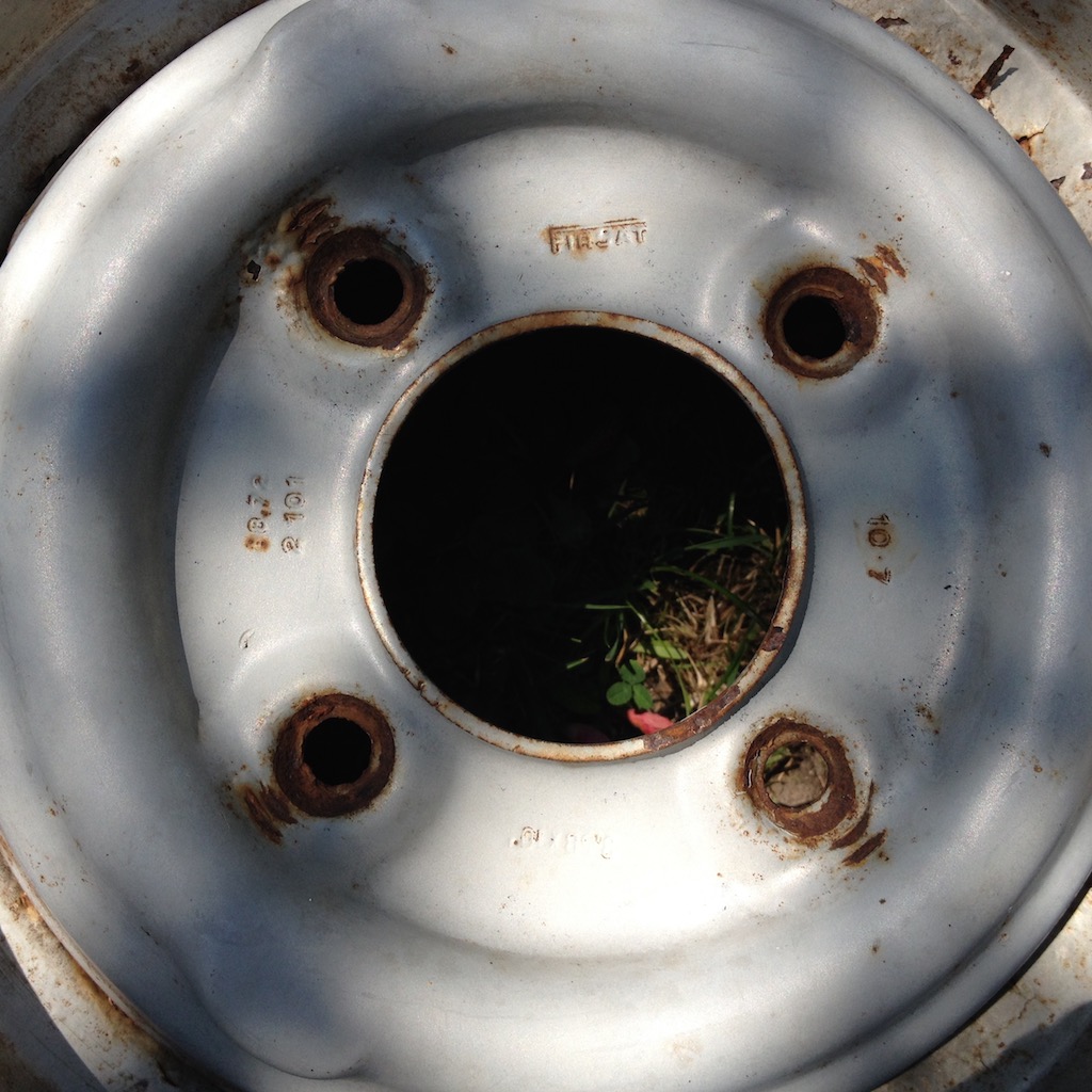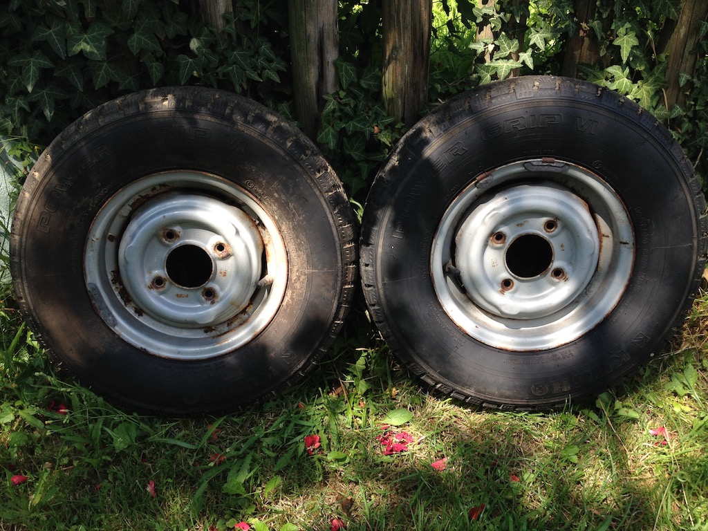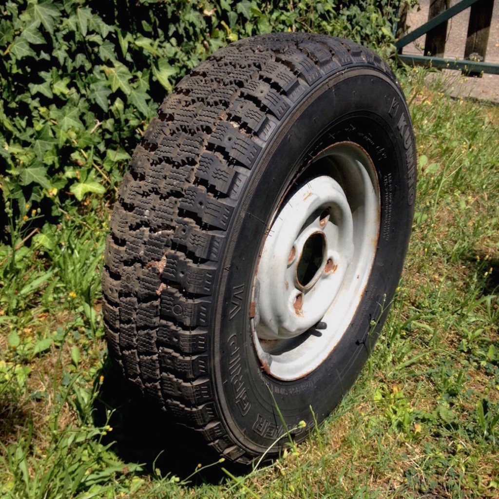 Zwei Stahlfelgen (Firsat 3,5x10). Es sind Winterreifen Kumho Powergrip IV mit vollem, grobstolligem Profi montiert, die ich altersbedingt für den Straßenverkehr ungeeignet halte.