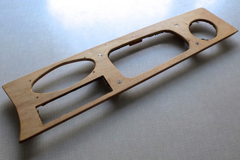 Armaturenbrett Rohteil. Es ist aus stabilem aber leichtem Sperrholz und hat bereits Ausschnitte für Lüftungsdüse, Handschuhfach, Radio und einen ovalen Monolautsprecher. Siehe Fotos.