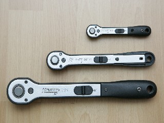 Bei der 3/8 Zoll fehlt der Obere Deckel vom Griff und eine Schraube am Griff, bei der 1/2 Zoll fehl eine Schraube am Griff, bei der 1/4 Zoll fehlen 2 Schrauben am Griff. Die Ratschen funktionieren trotz allem tadellos.