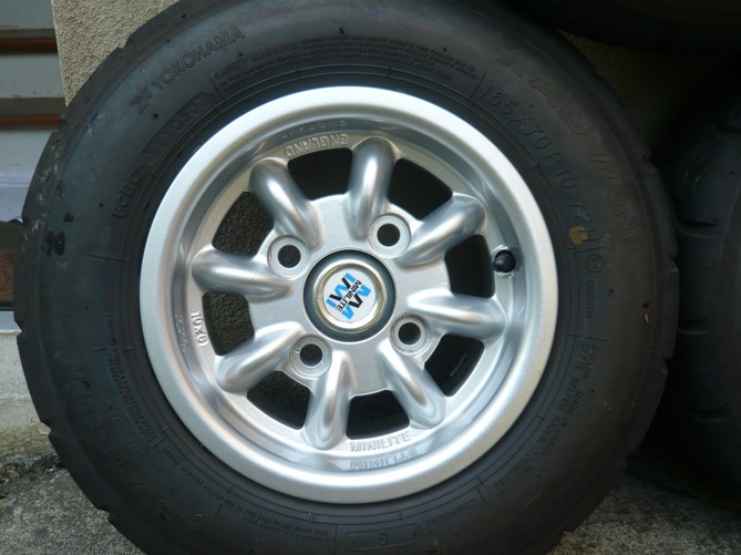 4 x Original Minilites 6 x 10", die Felgen sind makellos, praktisch neuwertig. Die Reifen, Yokohama A032 mit gutem Profil sind schon älter (DOT YYY0507 müsste Mai 2007 seine) inklusive Radmuttern -> 350,- EUR