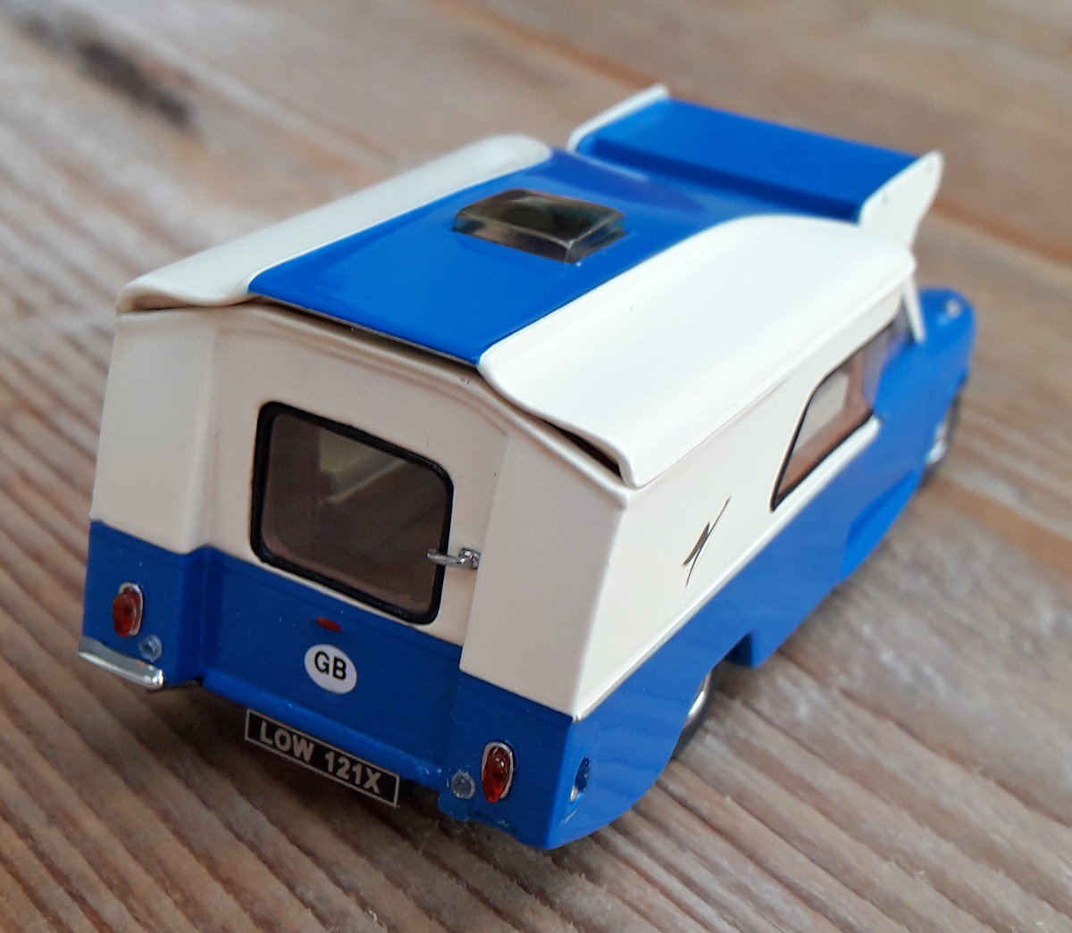 2. Spark Mini "Wildgoose" flach in Blau / Creme. Leider sind die Spiegel abgebrochen und auch nicht mehr vorhanden. Ebenso fehlt eines der beiden hinteren Stoßstangen-Eckchen. Der Rest erscheint soweit komplett und unbeschädigt. Preis EUR 60,-.