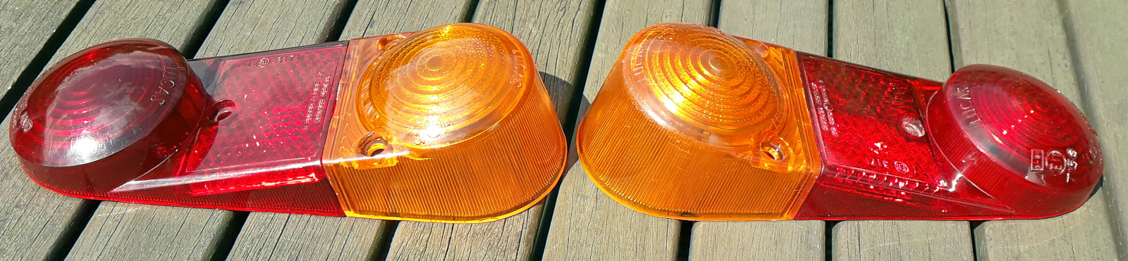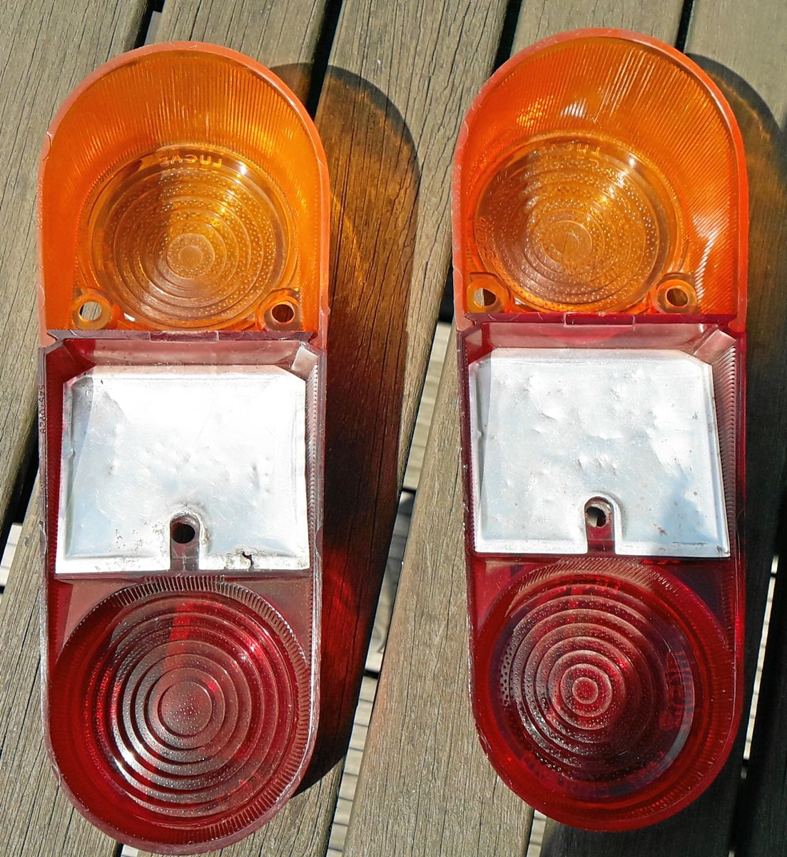 Die Gläser bestehen jeweils aus rotem Unter- und gelbem Oberteil. Letztere sind meines Wissens aktuell nicht neu erhältlich. Wirklich SEHR guter, sauberer gebrauchter Zustand ohne Risse, Stoßspuren oder starke Kratzer. Schrauben sind nicht dabei. Die Gläser sind beim Van / Kombi bekanntlich symetrisch, also nix mit rechts oder links.