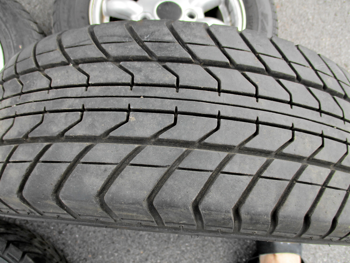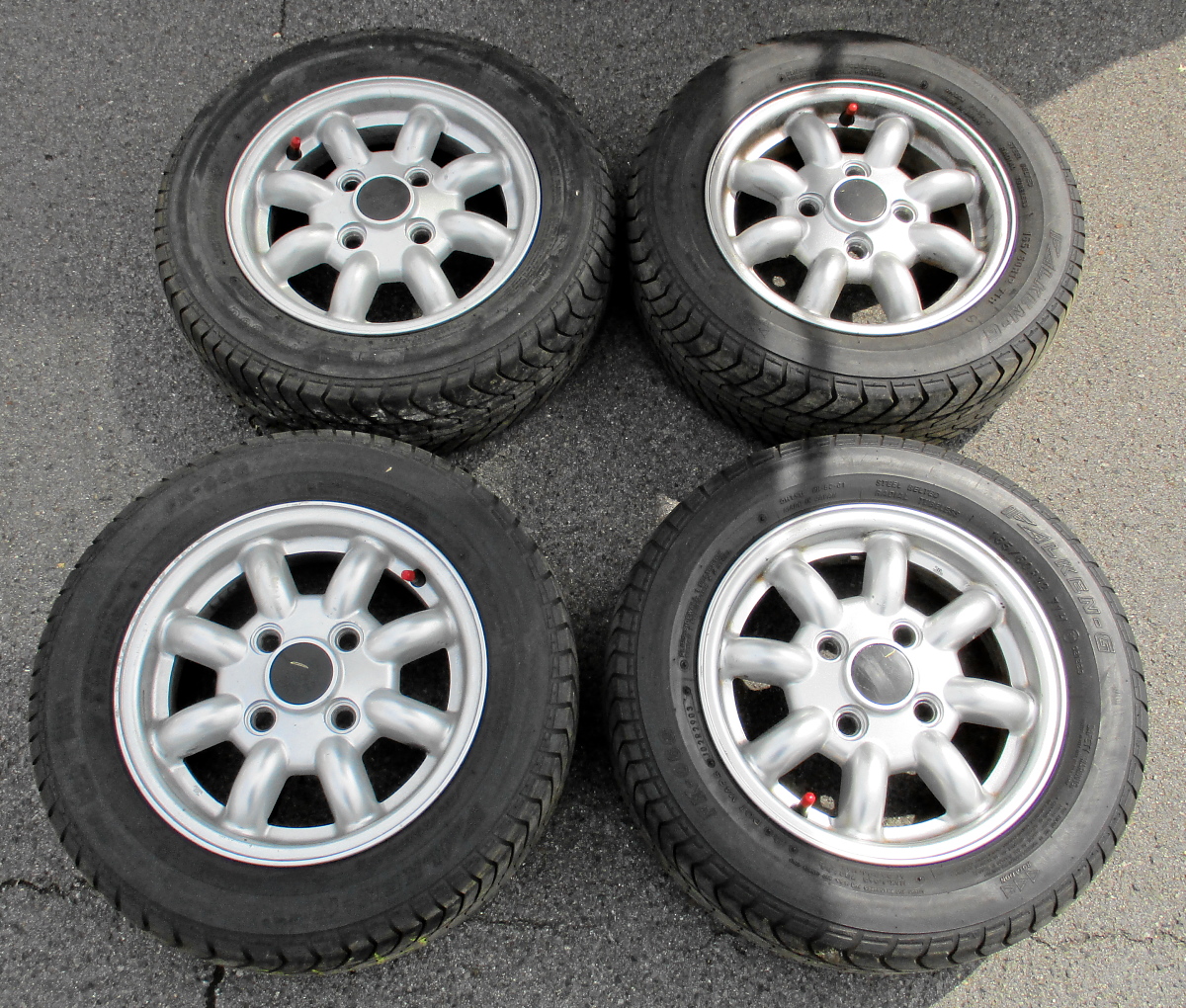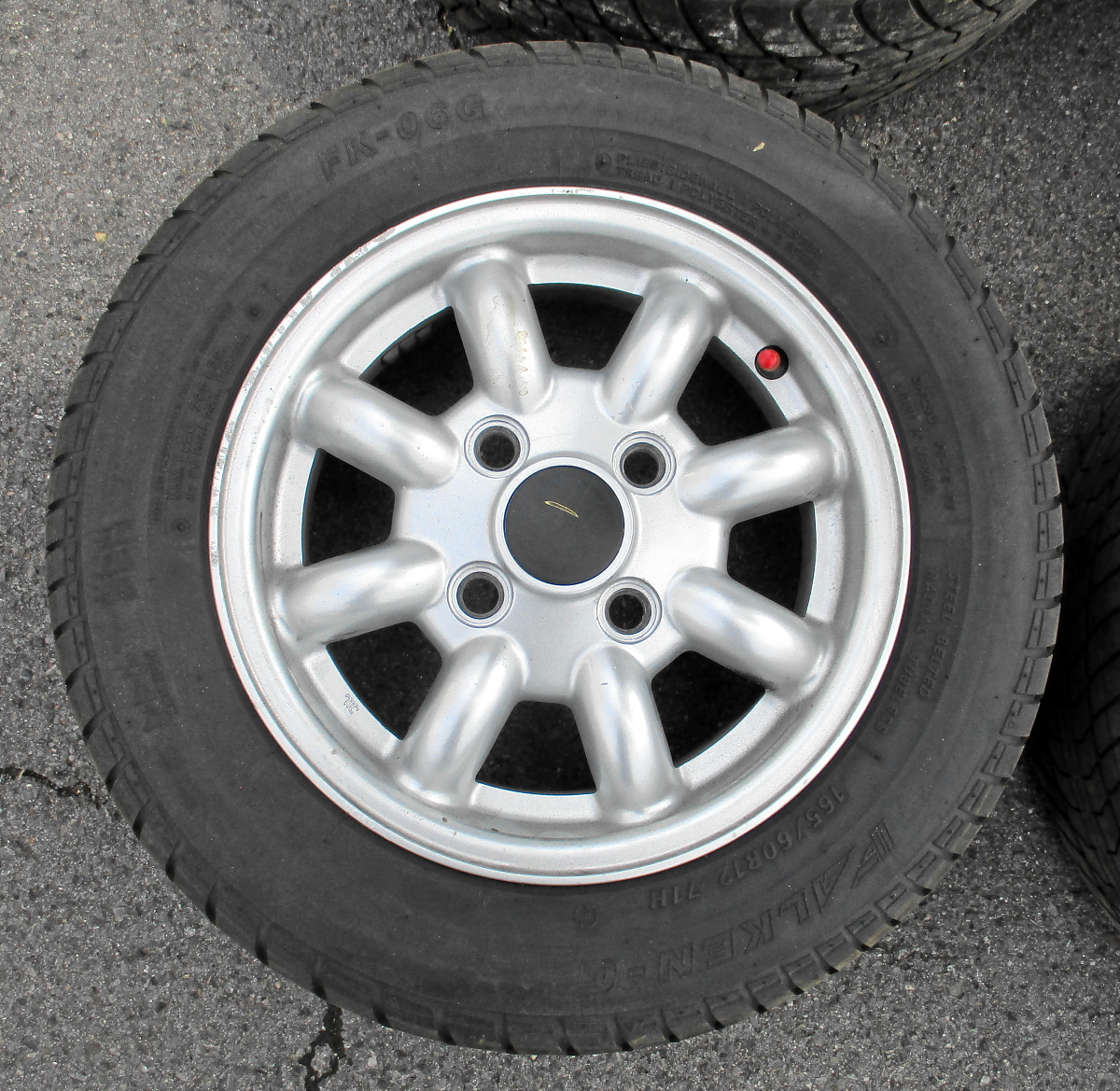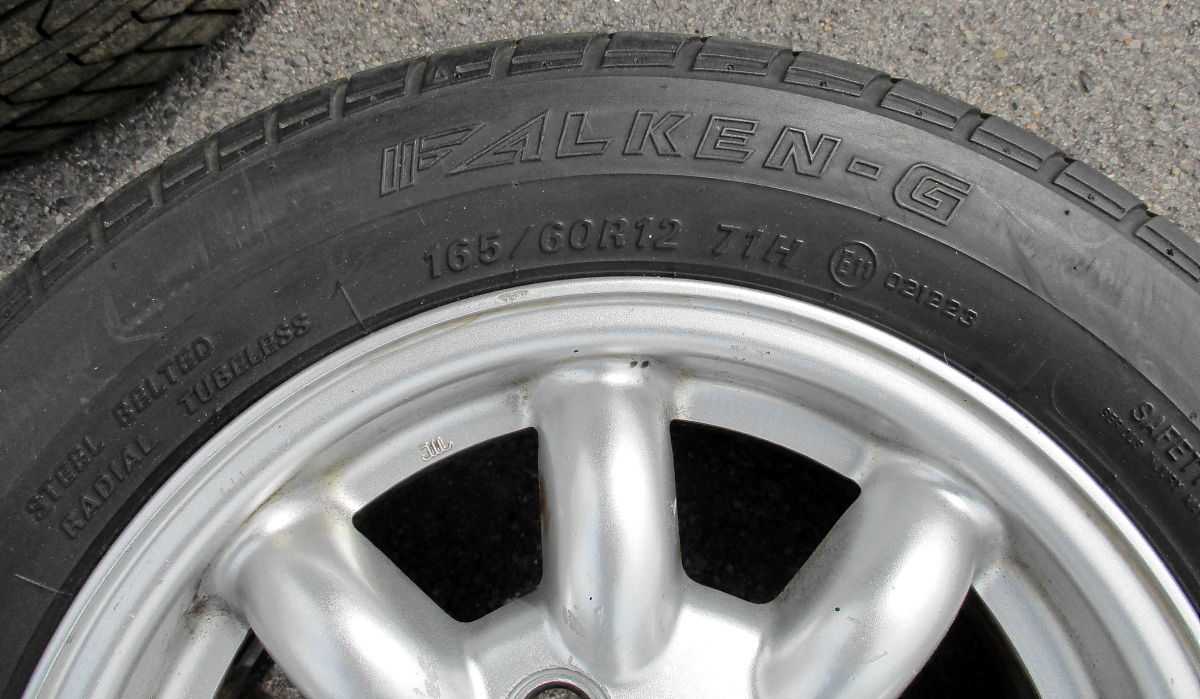 im Rahmen meiner Hallenleerräumvorbereitungsaktion sind jetzt vier Kompletträder übrig, nebst Zubehör. Es handelt sich um Serien-"Wurstfelgen", wie der Holländer sagt. Also 4,5x12" Alus im Minilite-Look. Darauf sind 165/60/12er Falken Reifen aufgezogen. Haben noch gut Profil (ca. 4 mm), sind aber DOT 29/03. Die Felgen sind in prima Zustand, eine hat leichte Kratzspuren außen (siehe Foto).