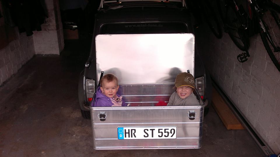 2 Erwachsene und 2 Kinder mit Mini + Minianhänger und Zelt