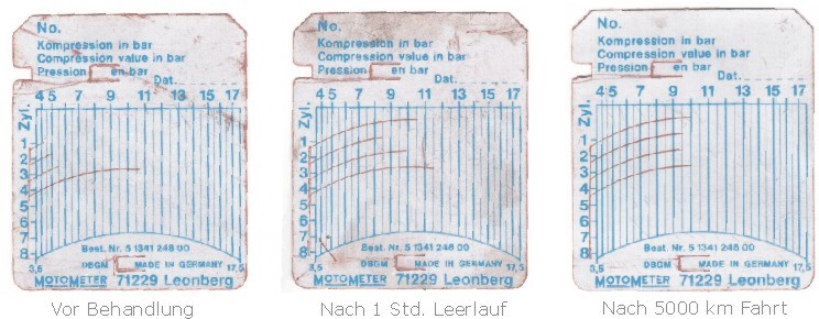 Nach der ersten Behandlung und einer Stunde Leerlauf lösten sich die verkohlten Kolbenringe (Reinigungseffekt) und die Kompressionswerte verbesserten sich deutlich, wie in der mittleren Abbildung zu erkennen ist.