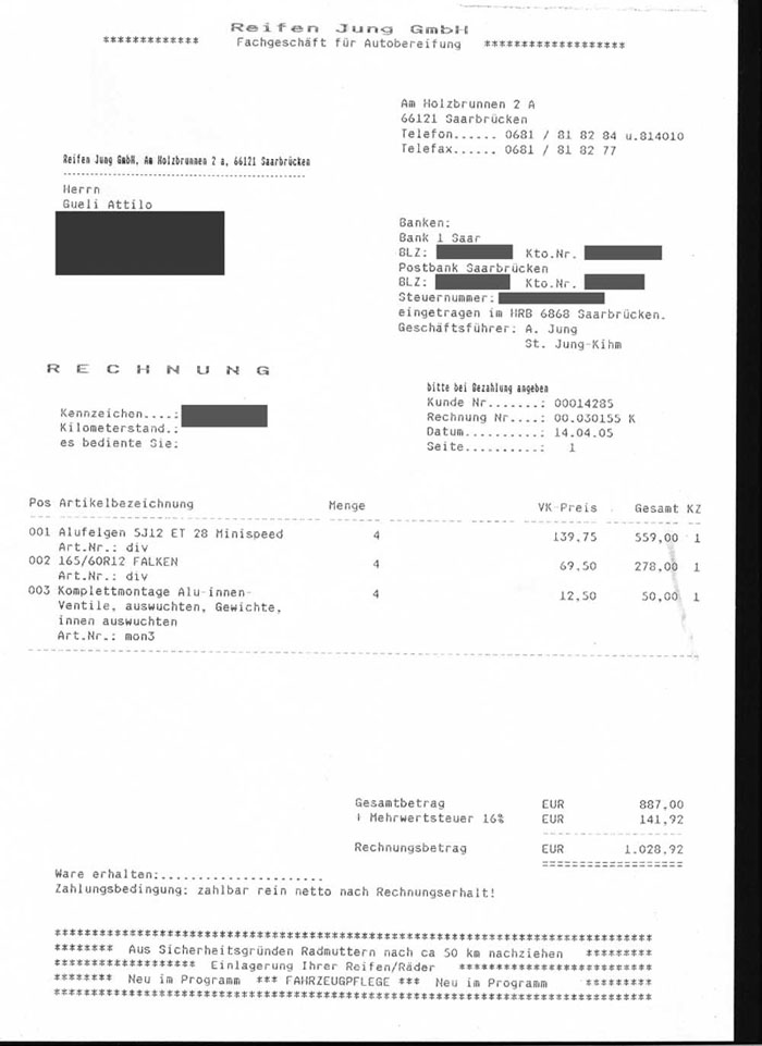 4 Minator Felgen 5Jx 12 mit 165/60/12 Falken (Fk-06-G).Sie wurden nur 1 Woche lang benutzt und sind neuwertig. Habe insgesammt um die 1000€ dafür bezahlt.
