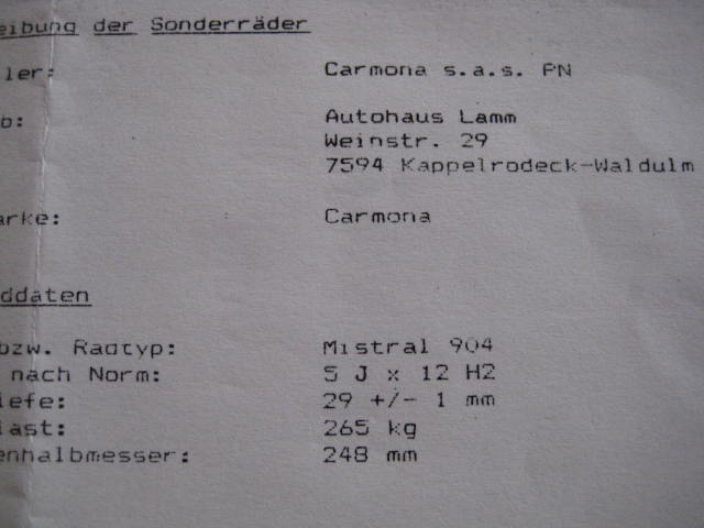 Das war Autohaus Lamm, Weinstrasse 29, 7594 Kappelrodeck-Waldulm. Ich werde morgen mal bei Fa Lamm anrufen und schauen ob die mir weiterhlefen kann. Im Gutachten ist als Hersteller Carmona gennant Felgentyp Mistral 904. Fa. Lamm war nur der Vertriebspartner. Ich habe noch zwei Bilder vom Gutachten beigefügt.