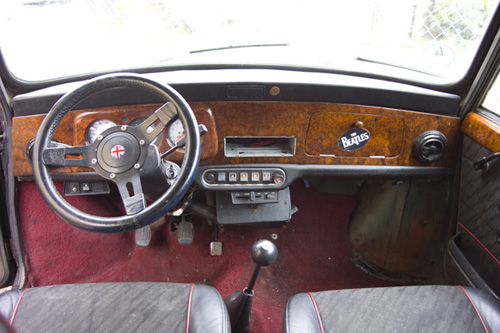 - auf die Original 12 Zoll Mini Stahlfelgen wurden Chrom Radkappen vom Austin Healey adaptiert, in dieser Kombi sehr selten!