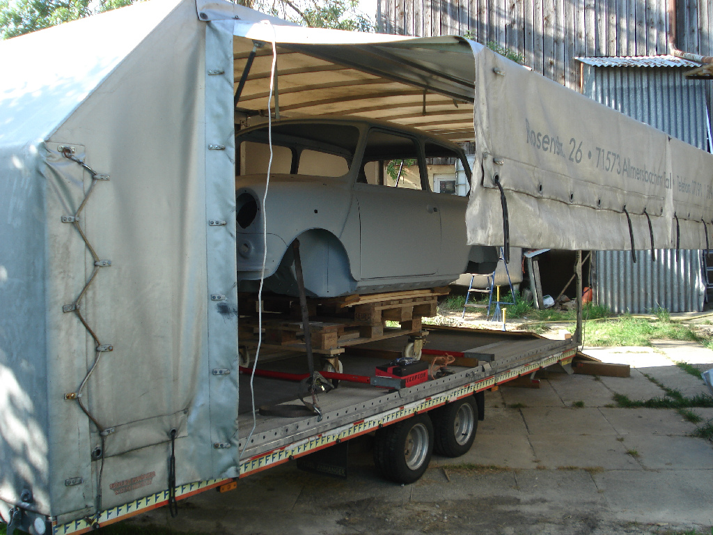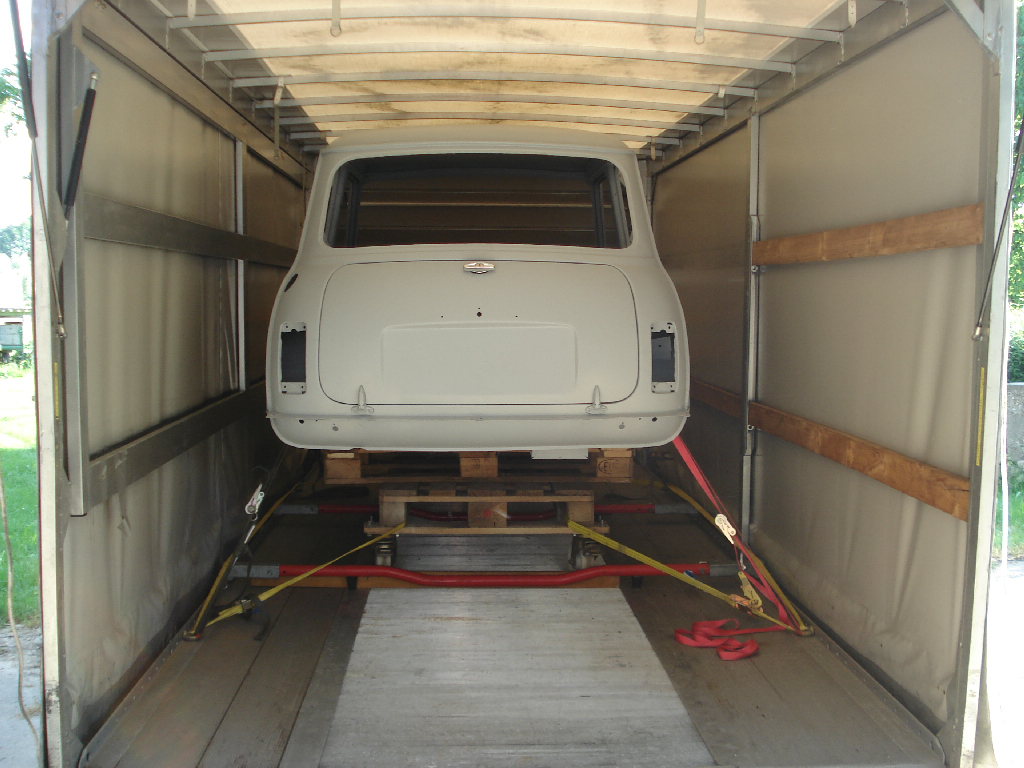Nachdem ich nun endlich alle anpass-Arbeiten an der Karosserie (Entfernen der Leiste an Motorhaube, Löcher für Verbreiterungen, Grill, Innenkotflügel, Aufstellfenster, Armaturenbrett, Stoßstangen, Sitzkonsolen, Tachowelle,...) abgeschlossen habe ist es nun endlich soweit und die Karosserie wurde heute zum Lackierer gebracht.