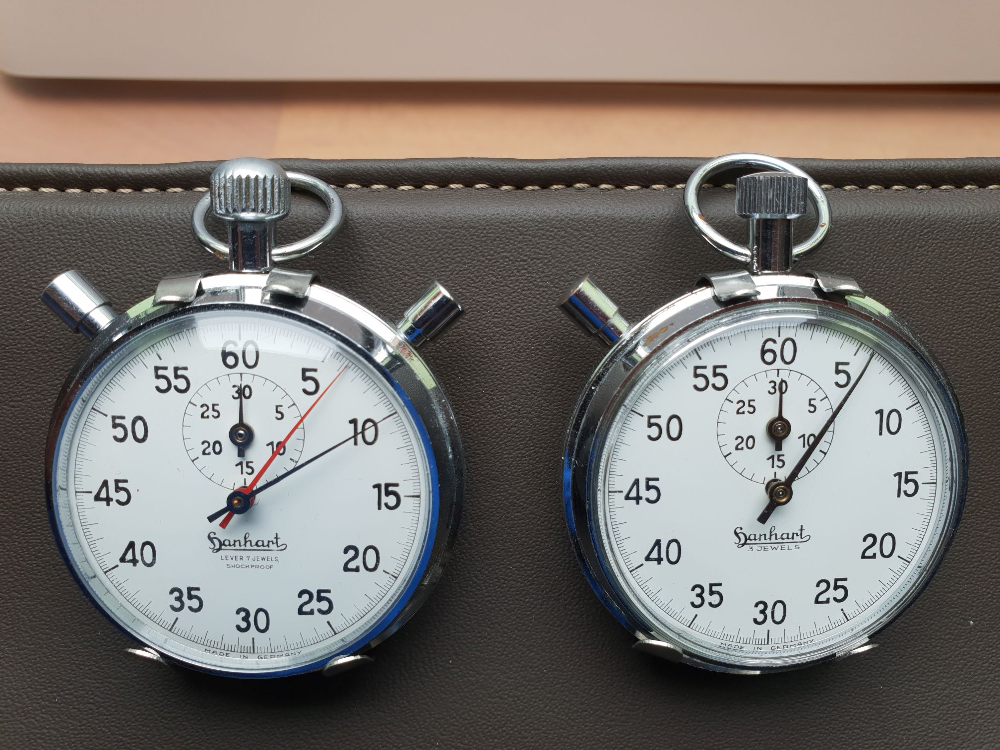 - Doppelstopper (die aufwändigste Variante, die haben einen Schleppzeiger, d.h. zwei Stoppzeiger übereinander, damit man kann man auch Zwischenzeiten stoppen)