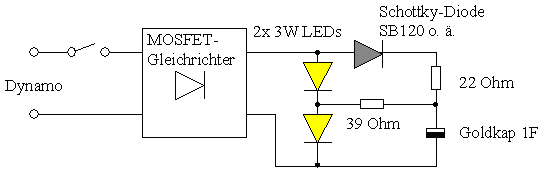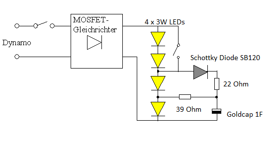 Die Sache mit der einen LED als Standlicht will ich gerne übernehmen, allerdings plane ich eine cree MC-E 4 fach LED zu verbauen, wobei ich 2 LED abschlalten können möchte (wenn der Dynamo bei langsamer Fahrt nicht genug Power bringt