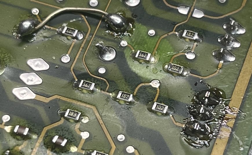 Hier mal ein interessantes Bild.... der Draht oben links ersetzt eine Leiterbahn in Layer 3 der Platine, die ich bei der ersten Reparatur ersetzen musste, weil durchgeglüht.
