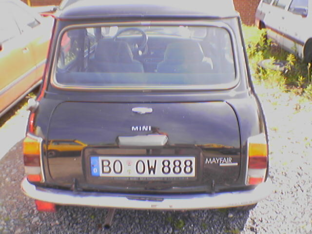 also, hier hab ich schomma ein Foto, ich hoffe, du kannst da was erkennen? Also hinten ist der echt noch total in schuss, wenn du detailaufnahmen brauchst, dann sag am besten wovon, ich hab nämlich keine digicam und mach das mit dem handy meines bruders (ggrrr). Die Türen muss ich auch nochmal fotografieren, kann die aber schonmal sagen, dass die beifahrertür noch total super ist, ohne beulen und ich hab auch noch keinen rost festgestellt, die fahrertür ist nicht mehr ganz so toll, aber durchaus noch brauchbar (schwarz sind die), fenster etc. ist alles noch drin.