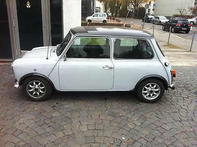 Farbe der Innenausstattung: SchwarzAustin Rover Mini Cooper 1300ccm Motor.Der Mini wurde 2011 komplett Restauriert und im sportlichen Retro-look neu aufgebaut. Rostfrei,PKW in Grau-Blau,Dach in Schwarz,wurde bei einer Fachwerkstatt lackiert. Neue Sportabgasanlage RC40 mit Fächerkrümmer,Zylinderk. bearbeitet,neue Ventile,Stösselstangen,Zündkabel und Kerzen,K&N Luftfilter,Vergaser gereinigt, Dichtsatz+synchronisiert, Hi-Lo - höhenverstellbares Fahrwerk, Spax (gelb) Sportstossdämpfer,Verteiler überholt, Keilriemen, Bremsbeläge, Motorgummis, Fahrwerkgummis, Scheibendichtungen, Lenkmanschetten inkl. Spureinstellung, neuer Sicherungskasten,neuwertige Sommerreifen+Reserverad auf Minilites 12", Umbau auf Tachoei, klassisches Lenkrad, Porschesitze, Türverkleidungen, Rückbank mit Nadelstreifenmuster, wie die Sitze gesattlert, Teppich und Dämmmatten, Radio, Verstärker, 2 Wege Lautsprechersystem, diverse Chromteile, Innen und Aussenspiegel, Einstiegleisten. ganz kleine Delle in der Tür Fahrerseite.