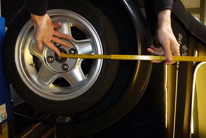 Ich sehe weit und breit keinen Ausfederungsanschlag. Der Anschlag erfolgt derzeit nur über die serienmäßigen, roten Koni Dämpfer.- Völlig ausgefedert beträgt der Abstand zwischen Radmitte und Verbreiterungsrand ca. 400 mm (siehe Fotos).