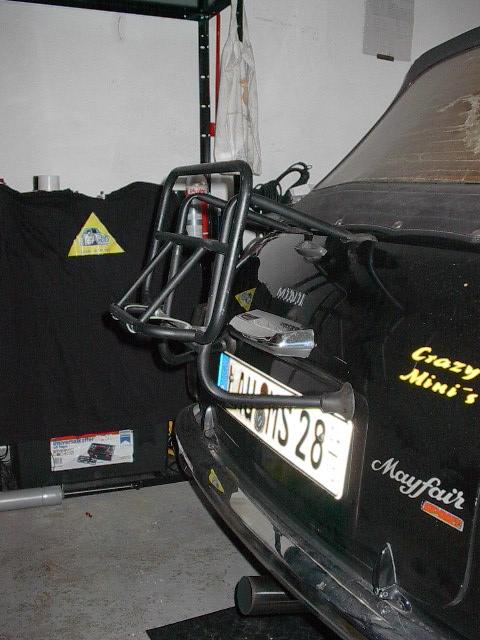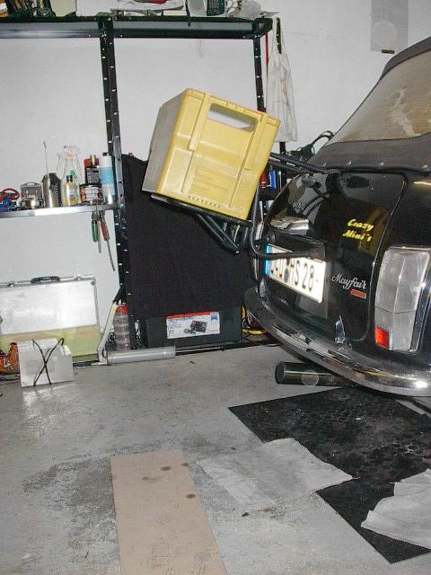 Wie bei der Vespa auch, wird der mit zwei Haken oben eingehakt und hängt dann da an der Keckklappe rum. Zur Fixierung sind dann noch zwei seitliche Haken dran, die Ich mit Gewindestangen versehen hab, für bessere Einstellmöglichkeit. Da der Gepäckträger in sich instabil wird wenn man Ihn soweit zusammendrückt das er das Kennzeichen nichtmehr bedeckt, hab ich zwei Traversen einschweissen lassen.
