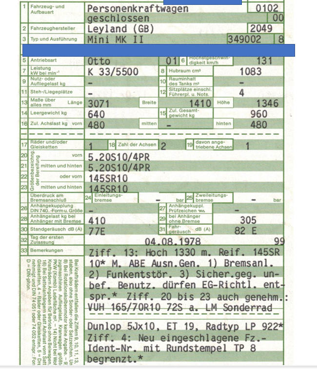 Und nun das Rätsel: (ich habe einen Zettel bei mir gefunden): Was bedeutet beim MINI die Anleitung von vorne nach hinten: rot, weiß, weiß, schwarz, blau, gelb? (ich kenne die Lösung)
