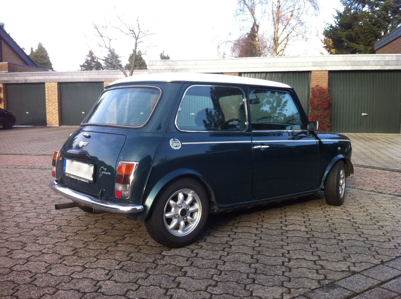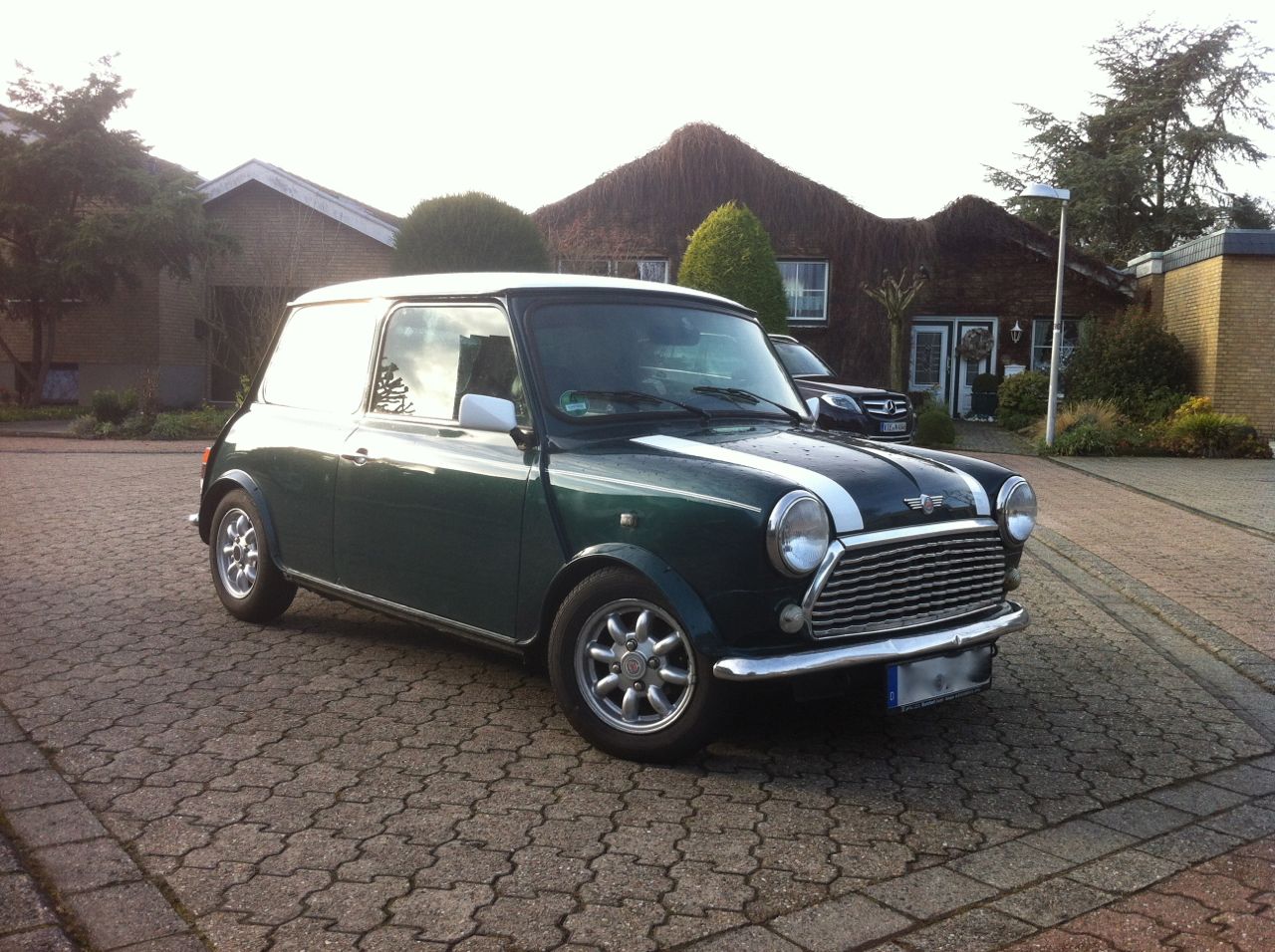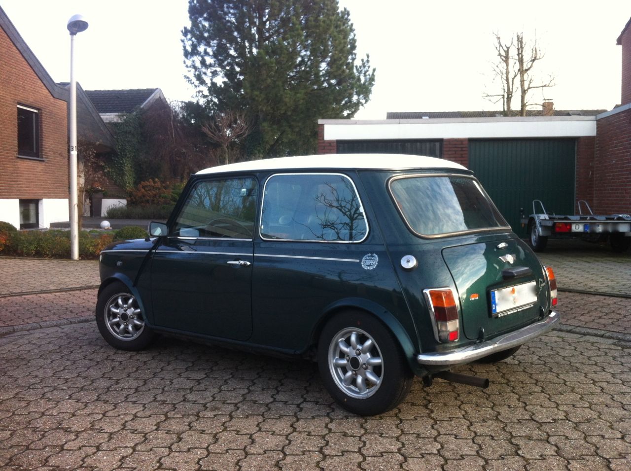 Der Mini ist abgemeldet und steht in einer trockenen Garage. Es ist ein Cooper in British Racing Green mit den bekannten Halbleder Bezügen und roten Zierstreifen