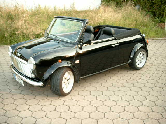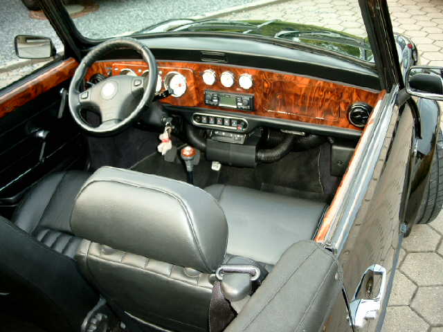 Seine Besonderheiten: Mengers Umbau zum Vollcabrio, Mitteldoppelrohrauspuff aus Edelstahl mit Supersound, Tieferlegung, 175/50R15 Reifen auf 7 Zoll Minilite-Felgen, Lederausstattung, Wurzelholz, CD-Radio mit Navi, Airbag und diverse Kleinigkeiten wie Cooper-Tankdeckel, Heckklappengriff aus Chrom ,....