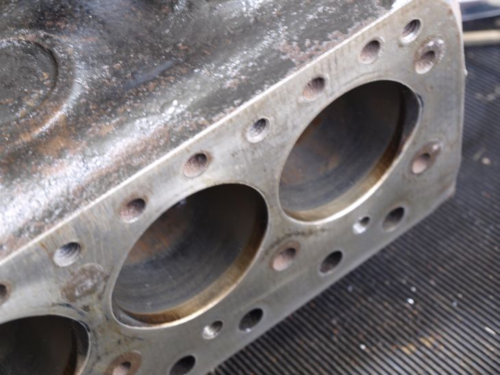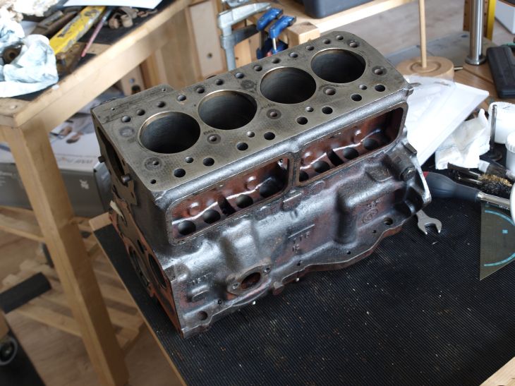 ich habe hier noch einen 1000er-A-Serie-Motorblock. Laut Aussage des Vorbesitzers wurde er vor wenigen tausend Kilometern überholt. Honspuren sind noch zu erkennen, keine Absätze in den Bohrungen zu fühlen. Die Bohrungen haben leichte Anschrägungen als Vorbereitung zum Einsatz eines 1300er Zylinderkopfes. Er hat kein Typschild mehr.