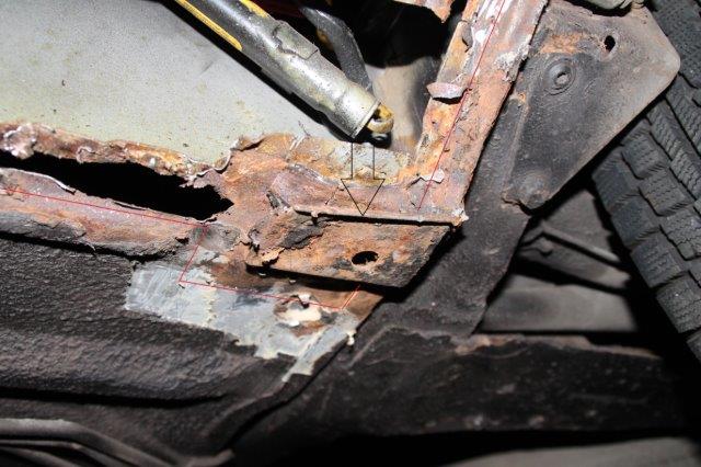 Das möchte ich natürlich ersetzen ,d.h. ich möchte auch hinter der Traverse das Bodenblech als Innenschweller hochziehen, so wie es wohl sein sollte.