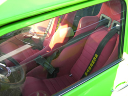 Zwei Sportschalensitze in Rot inkl. Hosenträgergurte, Chrom Carbonoptik Bremshebelverkleidung und Schalthebel.