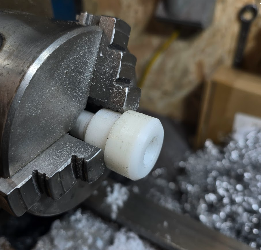 Ich habe aber nun endlich mal die Muße gefunden mich mit dem schon vor dem Umbau ausgeschlagenen Gleitlager der Schaltstange zu beschäftigen. Das hat ab höheren Drehzahlen doch etwas genervt. Mit Helm auf nicht so wild, aber der Wagen wird ja auch mal auf der Landstraße bewegt ;)Ich weiß es gibt Buchsen dazu, habe ich auch abgespeichert, aber ich probiere mal was anderes. Hatte noch einige POM-Stangen im Fundus, also ab auf die Drehbank. Mal schauen wie es sich macht. In dem Zuge habe ich die Führung auch gleich etwas verlängert.