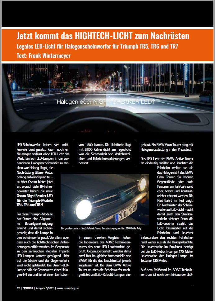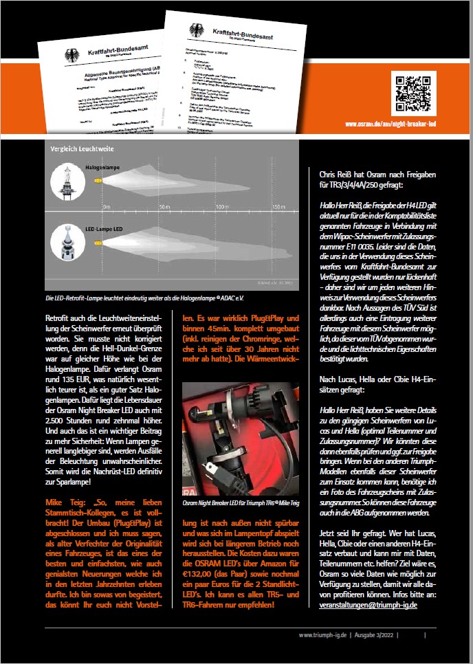 Ich stehe bzgl. der angegebenen Triumph-Modelle auch schon mit Osram in Kontakt. Da fehlen z.B. einige Modelle, die aber baugleich mit den anderen, zugelassenen sind. Wir sammeln gerade Nummern von Lucas, Cibie oder Hella-H4-Einsätzen, die viel mehr eingebaut wurden als die Wipac. Wohl auch in den Minis. Osram zeigt sich da sehr aufgeschlossen, die Zulassungen zu erweitern. Hier ein kleiner Bericht aus unserer Clubzeitschrift der TR-ID-Südwest.