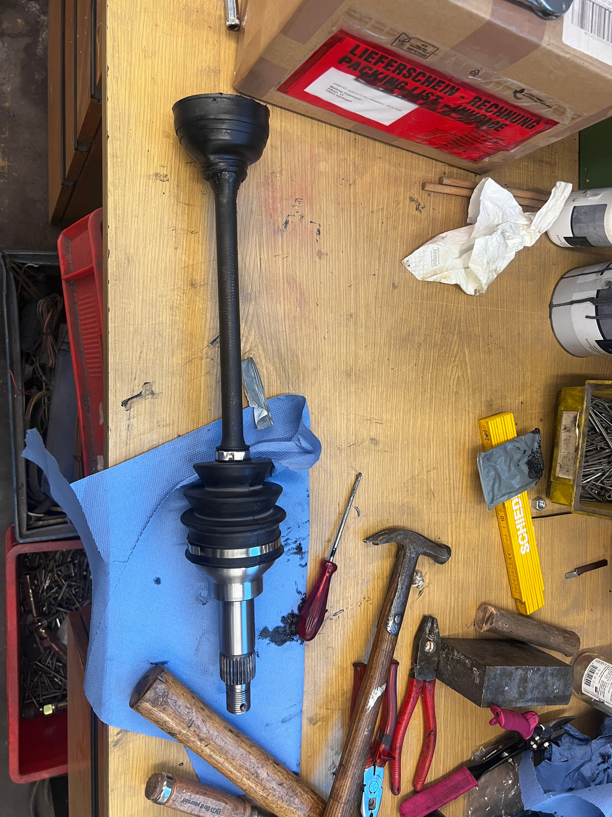 Angefangen mit den Antriebswellen. Die habe ich 2024 schon mit Hilfe einer Flex von ihren verrosteten Gleichlaufgelenken befreit, jetzt wird es Zeit, dass die Antriebswellen neu aufgebaut werden.