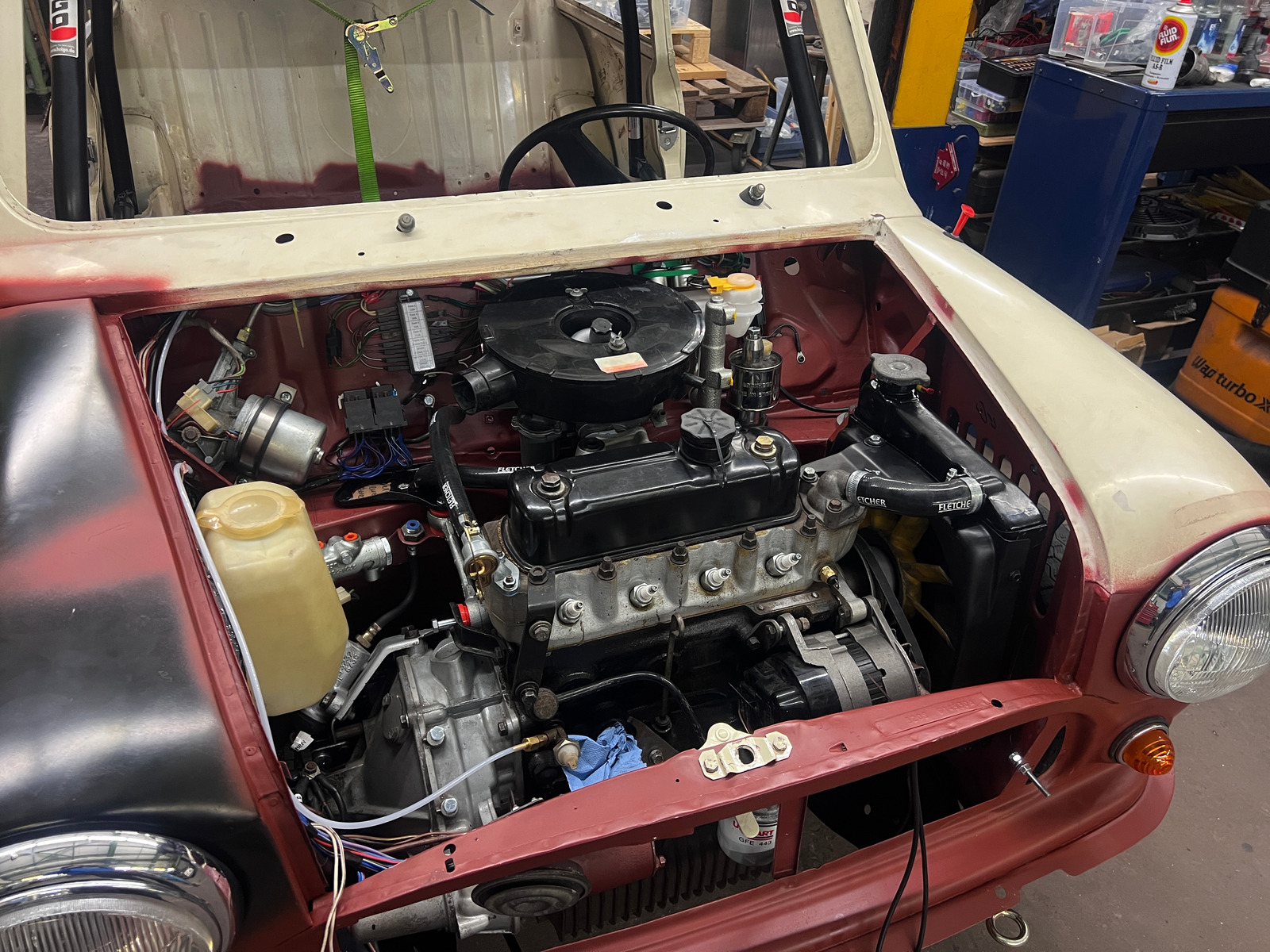 Als Vorausplanung für zukünfige Motoren und evtl. damit verbundene Ölkühler hab ich dem Mini noch eine 45° Frontstrebe verpasst bevor es an die großen Änderungen ging: