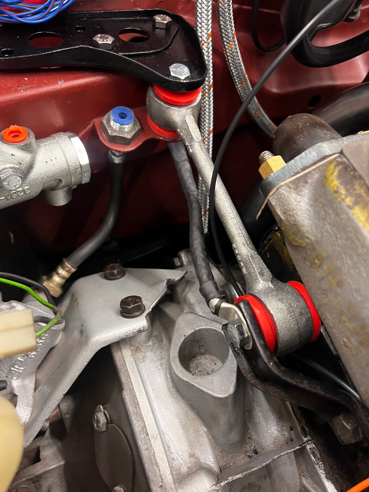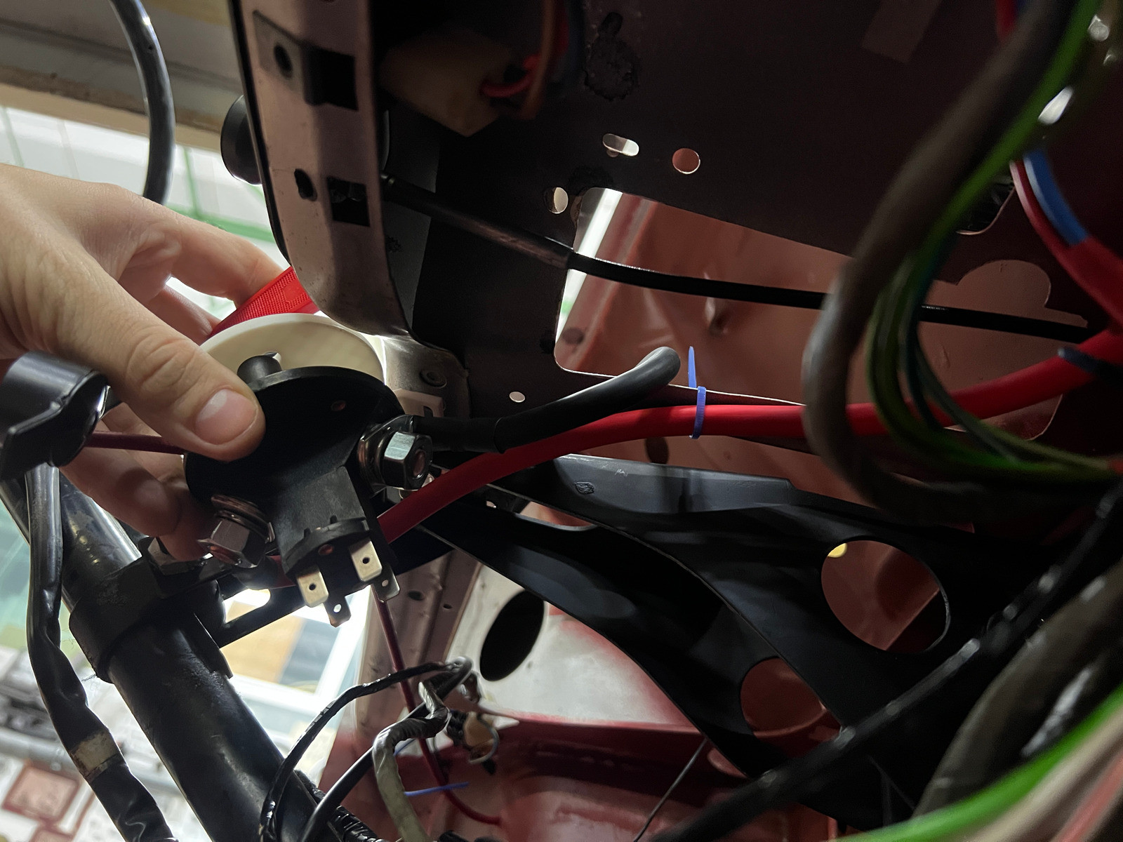 Der Kill-Switch wird später mittels Halter neben dem Lenkrad befestigt, der Plan ist mit dem Kill-Switch sowohl die Zündung, als auch das Batterie-Plus zu unterbrechen. Hier würde sich die originale Führung des Batteriekabels auf der rechten Seite des Autos die Sache schwerer machen als sie sein muss, deswegen habe ich ein neues Batteriekabel selber gebaut. Es besteht aus einem 25mm2 hochflexiblen Batteriekabel, das aus dem Kofferraum zusammen mit dem Kabelbaum über den linken Dachhimmel durch die C- und A-Säule läuft. Danach geht es hinter dem Armaturenbrett zum Kill-Switch. Von da geht ein rotes Kabel unter dem Armaturenbrett durch die Spritzwand und dann final mit dem Rest des Kabelbaums zum Magnetschalter.Außerdem geht das Dauerplus erst durch den Schalter bevor es an am Zündschloss anliegt, außerdem geht ein Plus vom Magnetschalter über einen Widerstand auf Masse, damit im Falle eines Unfalls das Auto auch wirklich Stromlos ist.
