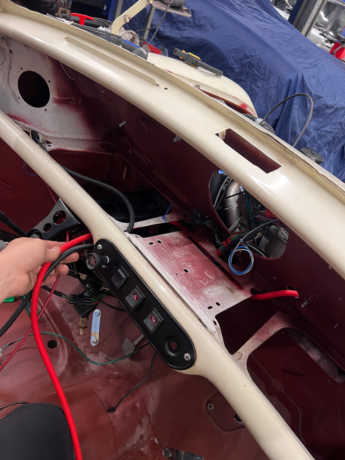 Deswegen hab ich unterhalb des Scheibenwischermotors ein weiteres Loch gebohrt, jetzt wird das Kabel hinter dem Armaturenbrett entlang geführt bis es im Motorraum durch eine geplante Gummihülse wieder mit dem Hauptkabelbaum verbunden wird.