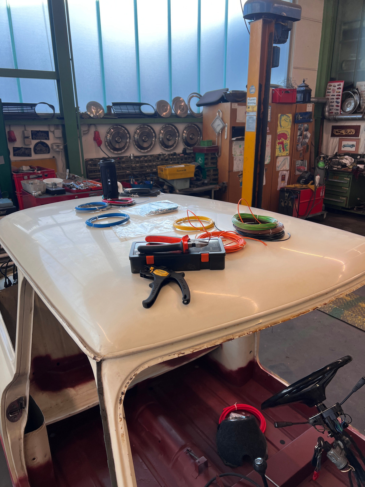 Unter anderem habe ich am Kofferraumdeckel die unnötigen Löcher zugeschweißt und die Heckklappe befestigt, sowie viele, viele Kabel gezogen.