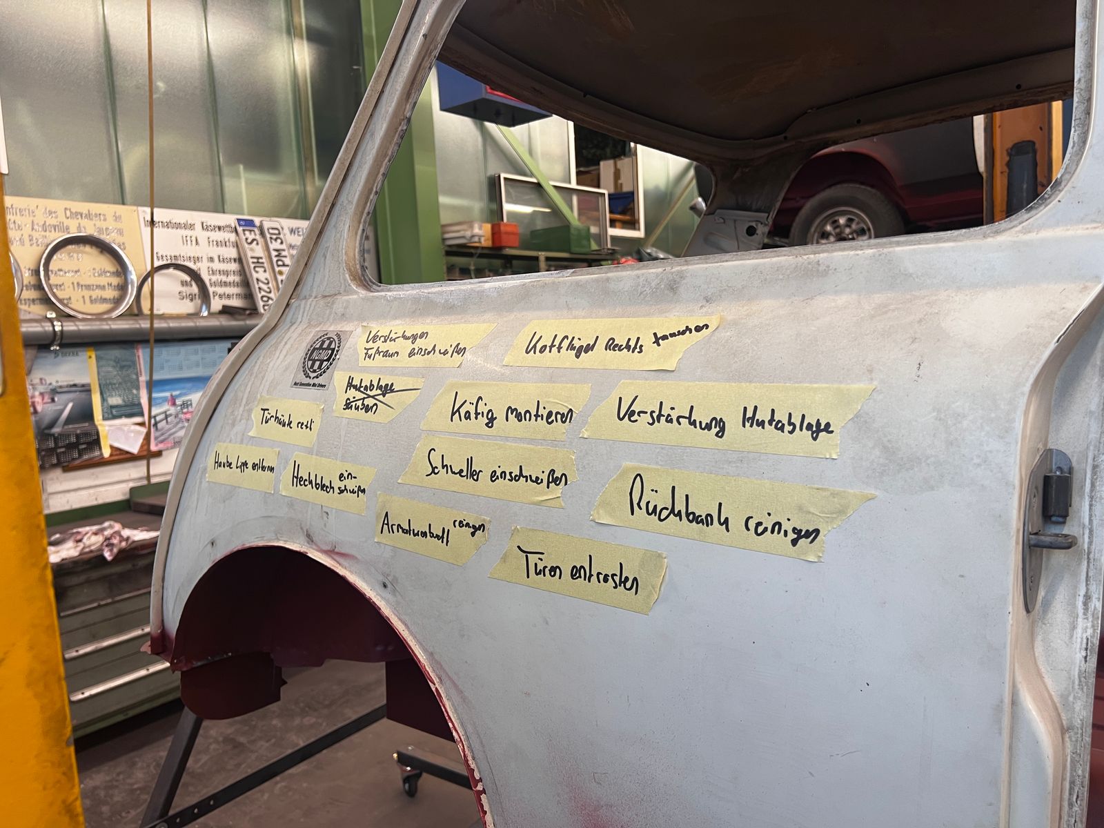 So. Gestern hab ich mal am Mini zusammengefasst, was jetzt an der Karosserie noch alles fehlt, bevor das erste Mal die Hilfsrahmen drunter können. Die Liste ist dann doch etwas länger geworden, wird aber von Tag zu Tag kürzer.
