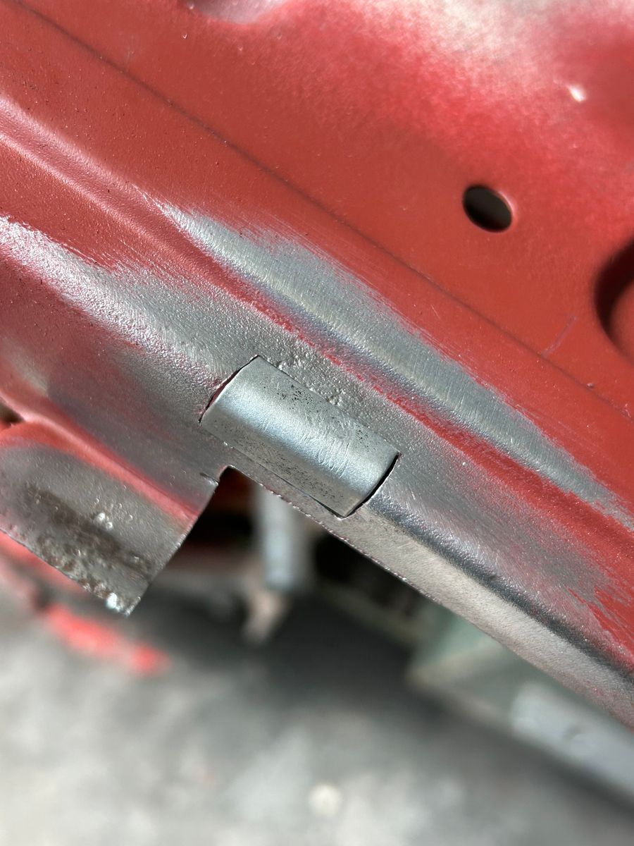 Ich befreite unterdessen erstmal die andere Tür von ihren Türscharnieren, was sich leichter anhört als es wirklich war. Die Schrauben an den Scharnieren waren nicht nur festgerostet, sondern auch rund. Also aufbohren, ausdrehen. Nachdem das geschafft war, wurde die Türhaut mit Hilfe eines Stechbeitels in mühsamer Kleinarbeit umgebogen, mit der Fächerscheibe an den Schweißpunkten abgeschliffen und die Türhaut entfernt. Die Tür wurde dann ebenfalls mit der Reinigungsscheibe und Drahtbürste von Rost befreit, da sie allerdings etwas schlechter war als die andere, wurde sie davor noch großflächig mit Rostumwandler eingestrichen. Danach ebenfalls grundiert, hier wird nächste Woche ein Reperaturblech zum Einsatz kommen.