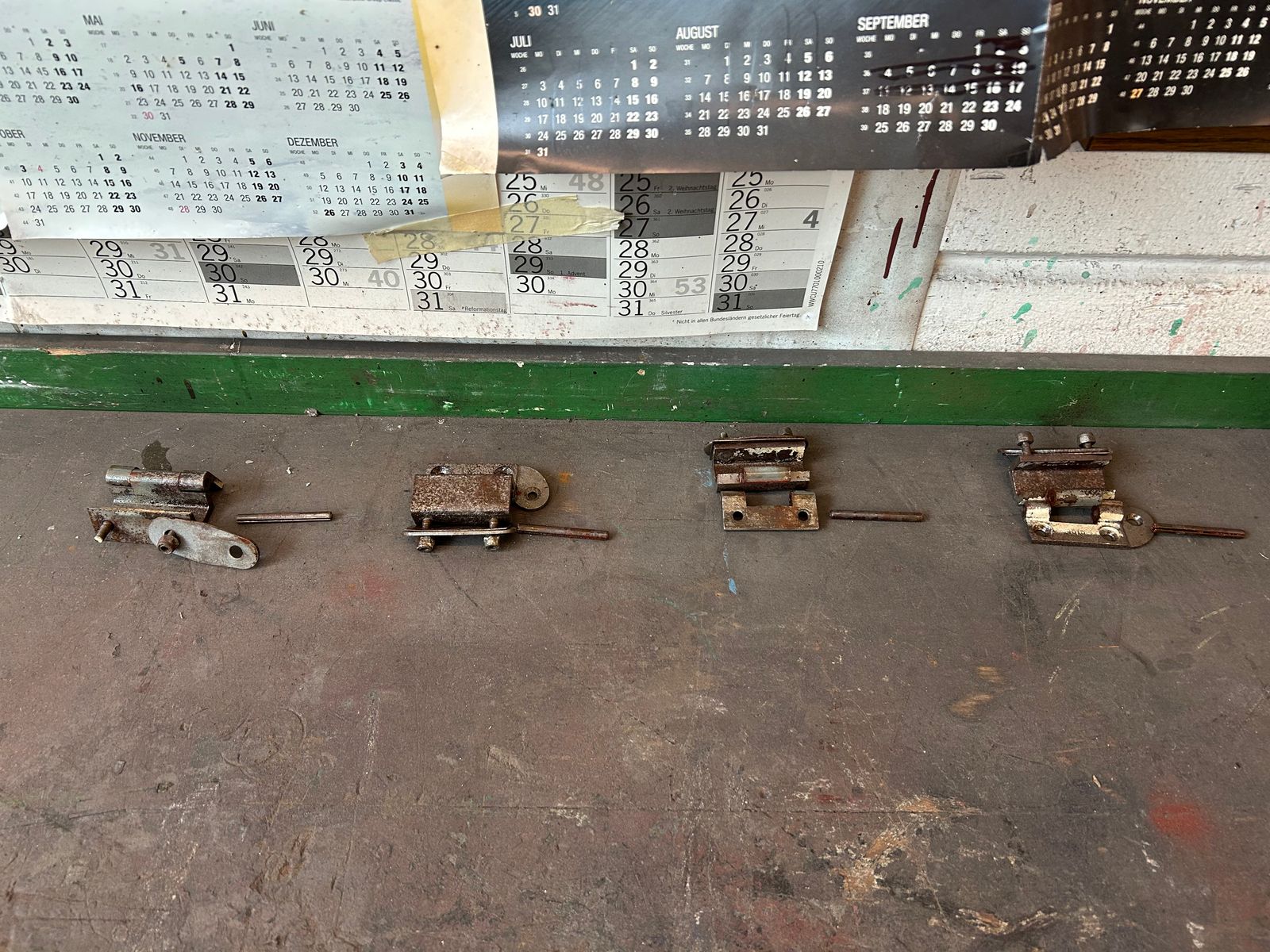 Die Türscharniere waren ziemlich schwergängig, weswegen sie für mehrere Tage in WD40 eingelegt wurden, bevor die Splinte mit einer dafür zurecht geflexten Schraube ausgetrieben wurden. Dann einmal alles gebürstet, gereinigt und passend für die Weiterverarbeitung fixiert.