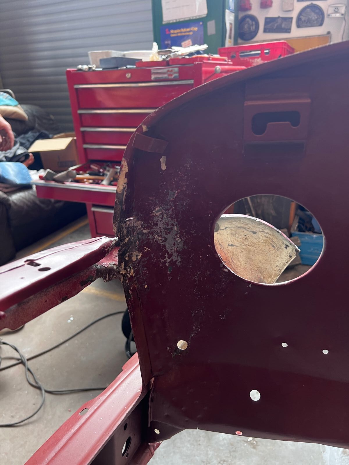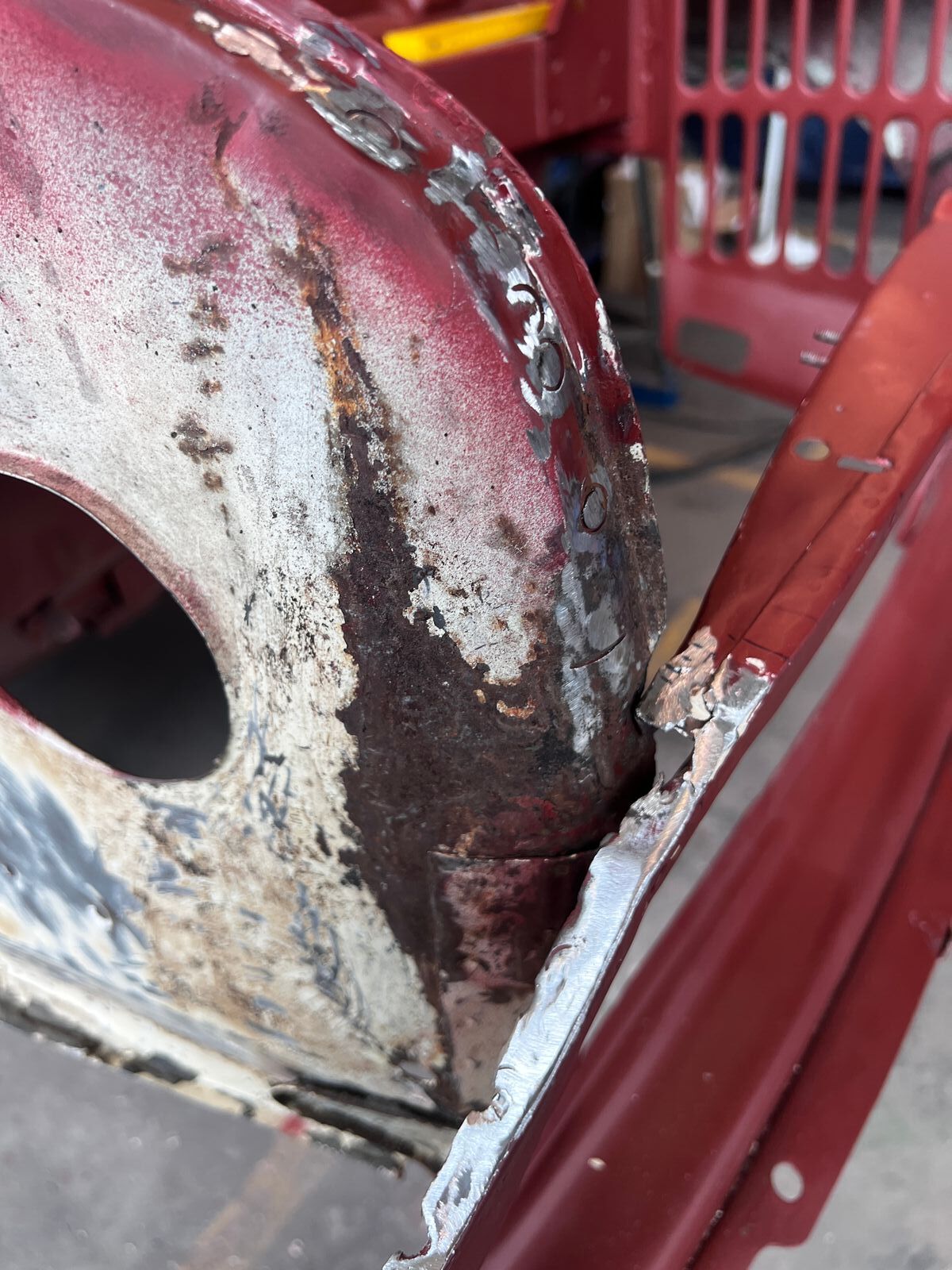 Ehrlich gesagt traue ich mir nicht zu, eine Stelle zu schweißen, die das Aussehen des Autos so maßgeblich beeinflusst wie der Kotflügel. Die Form muss exakt der Fluchtlinie des Falzes und der Frontmaske entsprechen, und... nein.