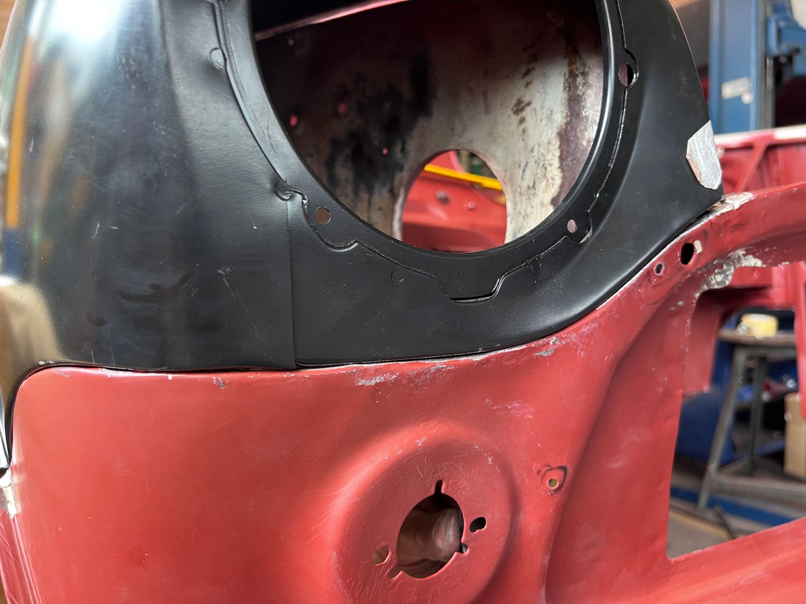 Die Frontmaske ist glücklicherweise von den italienischen Schweißkünsten verschont geblieben, den Falz muss man etwas säubern aber die Frontmaske kann da bleiben wo sie ist, der andere Kotflügel ist ebenso top.