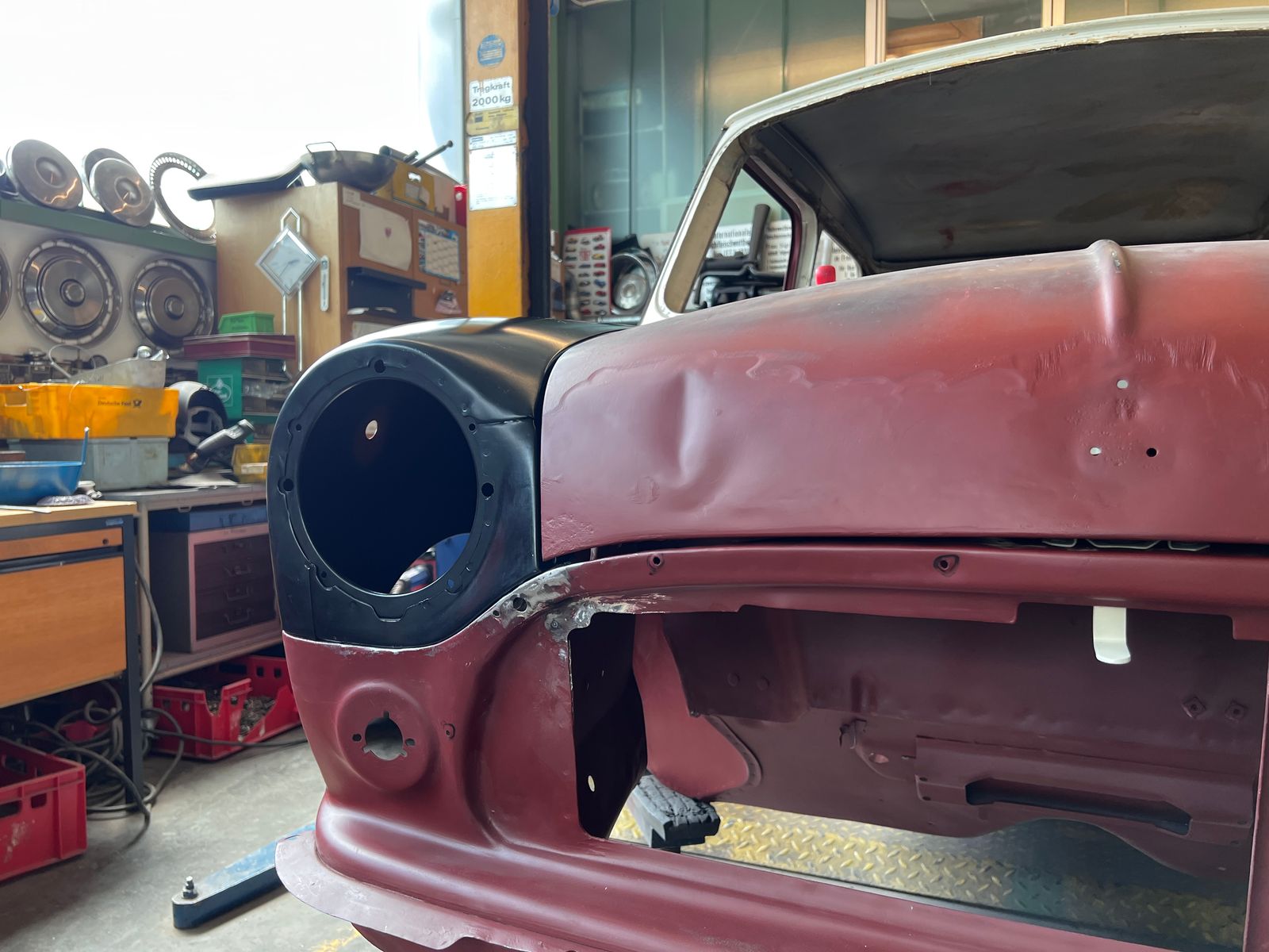 Bevor der Kotflügel ran kann, mussten noch einige Löcher geschlossen werden. Einerseits die Löcher in der Front für den Mk2 Kühlergrill, andererseits zwei größere Löcher in der Front deren Zweck mir bis heute nicht ganz klar ist, sowie die Löcher des herausgebohrten Aschenbechers. Vielleicht weiß ja jemand von euch wofür die größeren Löcher ursprünglich gedacht waren? Zusatzscheinwerfer dürfte er nie gehabt haben.